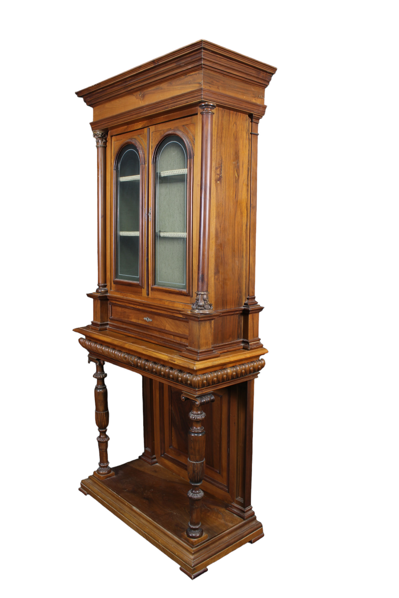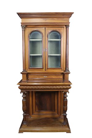 VETRINA A DUE ANTE in noce sorretta da consolle sostenuta da gambe a colonna con capitelli Sicilia XIX secolo h cm 229 x 103 x 46