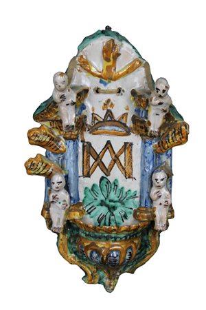 ACQUASANTIERA in maiolica policroma raffigurante Tempio con angioletti manifattura italiana meridionale XVIII secolo h cm 32 x 19 x 6,5