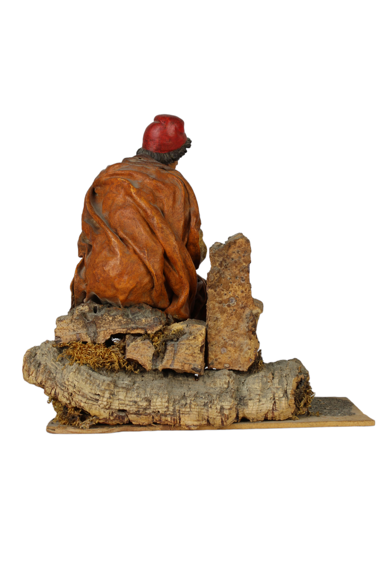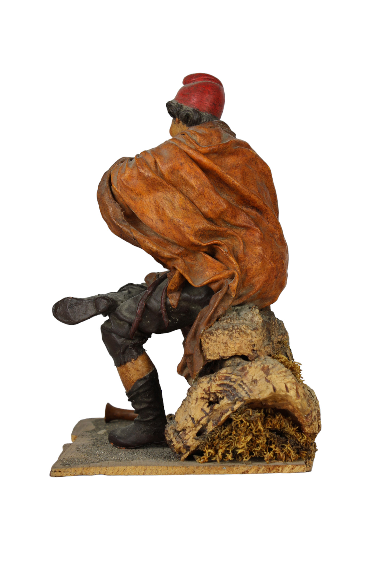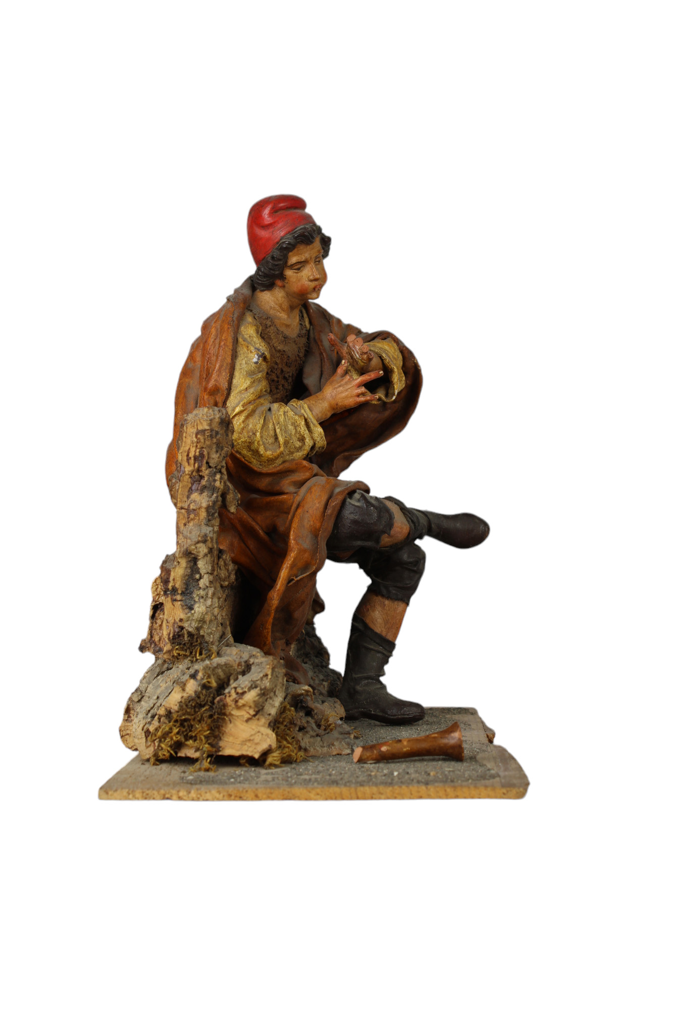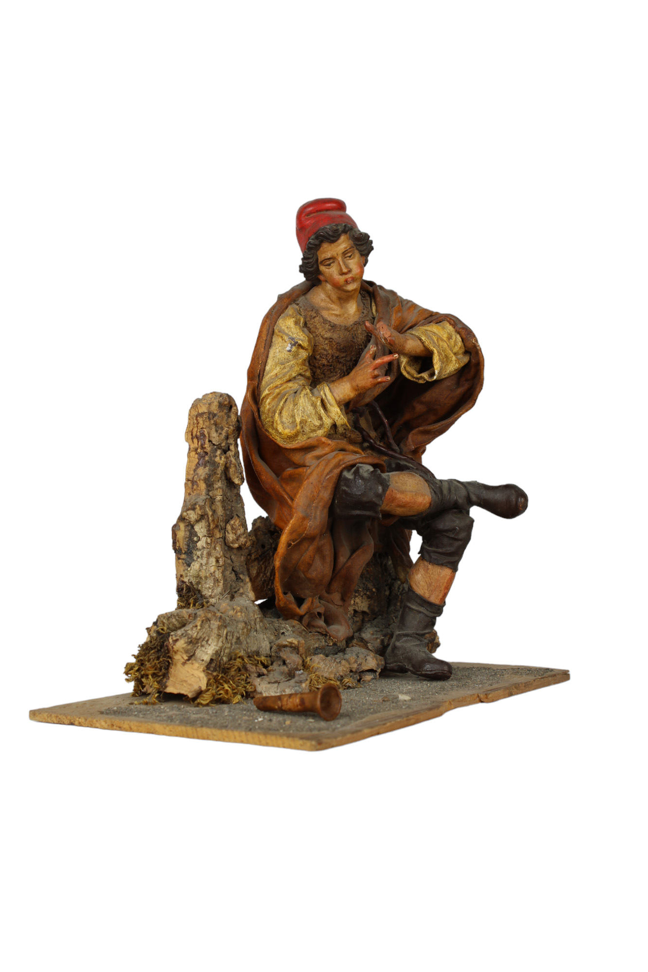 PASTORE DA PRESEPE in legno e cartapesta policroma raffigurante suonatore di piffero attribuibile al maestro Giovanni Antonio Matera scultore Trapani 1653-Palermo 1718 h cm 22,5 x 23 x 14