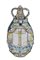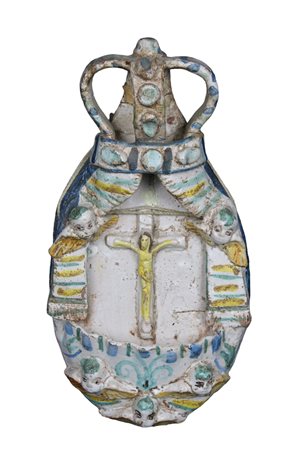 ACQUASANTIERA in maiolica policroma raffigurante Crocifisso e angeli, vecchi incollaggi alla corona manifattura popolare sud Italia XIX secolo h cm 33 x 17 x 6