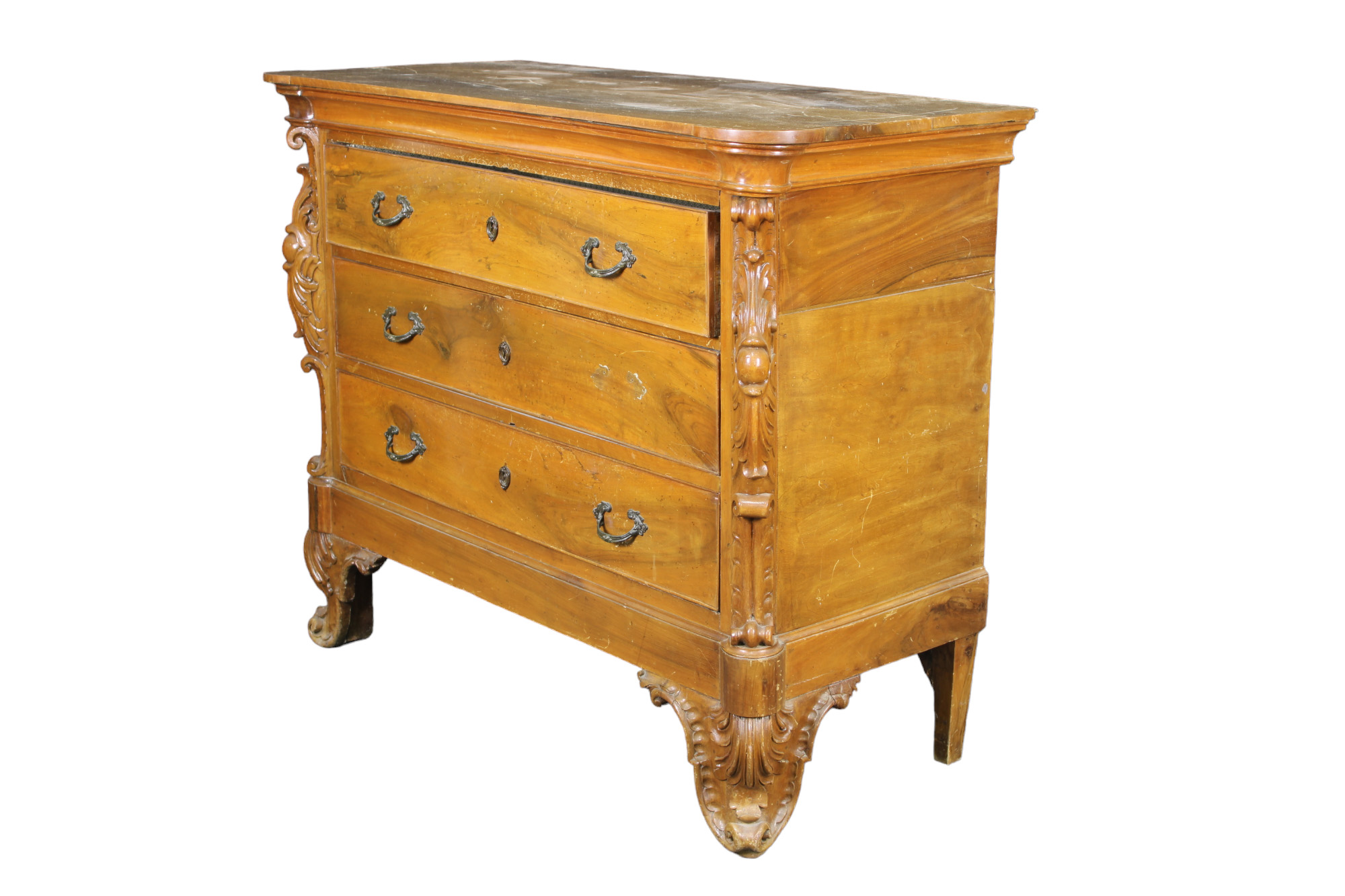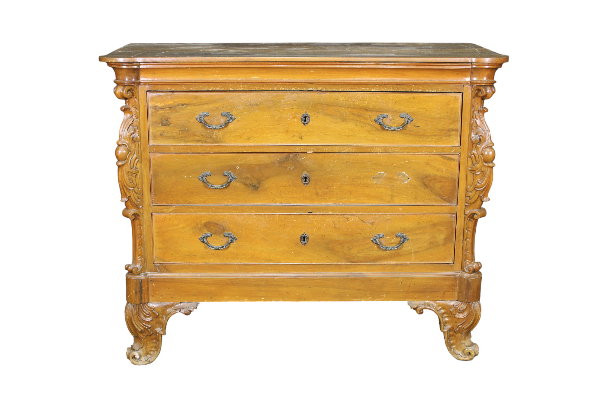 ELEGANTE CASSETTONE in legno di noce finemente scolpito a tre cassetti Sicilia primi 800 h cm 108 x 133,5 x 60