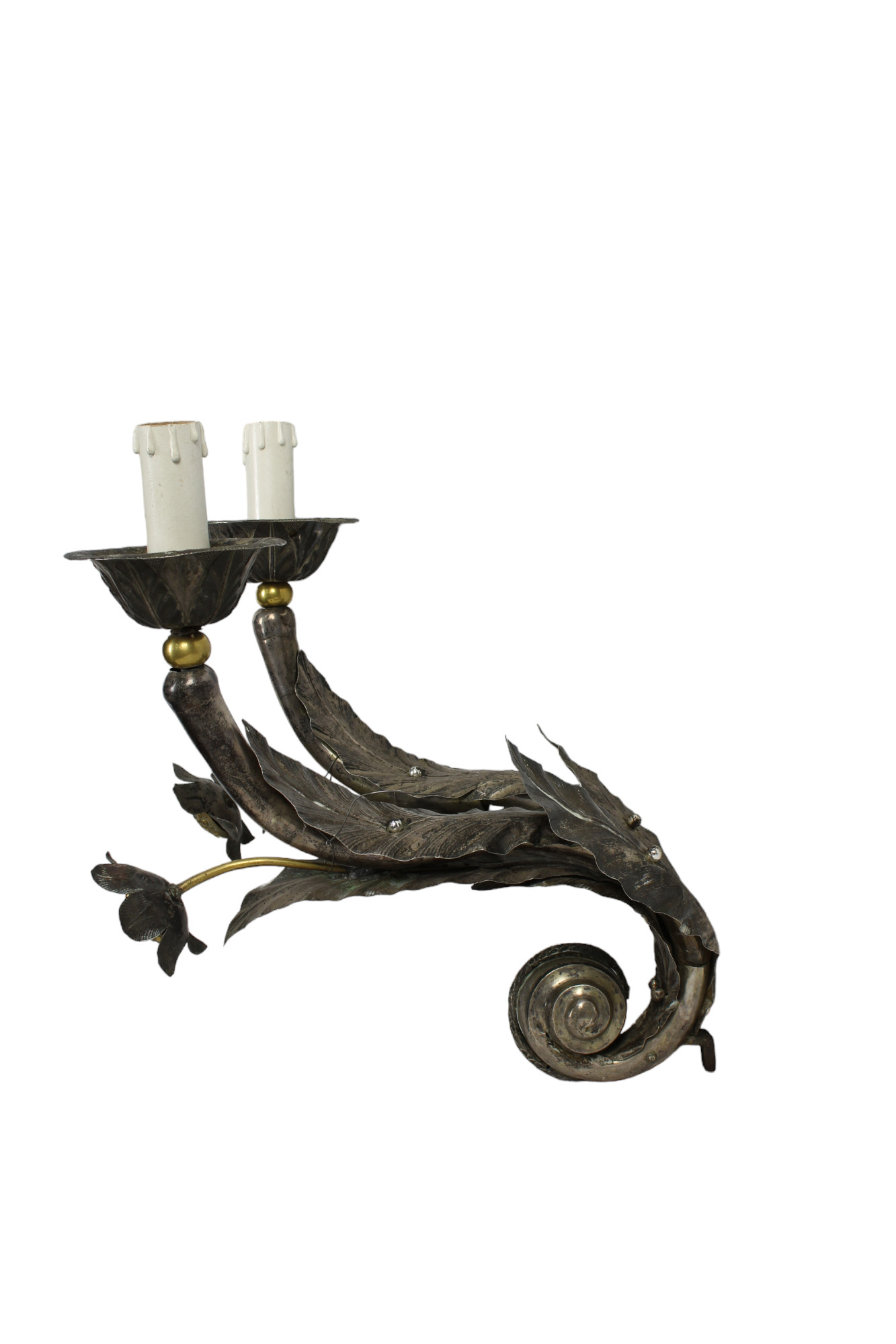 COPPIA DI IMPORTANTI APPLIQUES DA MURO A 2 BRACCIA in argento sbalzato e finemente cesellato decorati da foglie e fiori maestranze italiane 1805 circa h cm 60 x 37 x 48