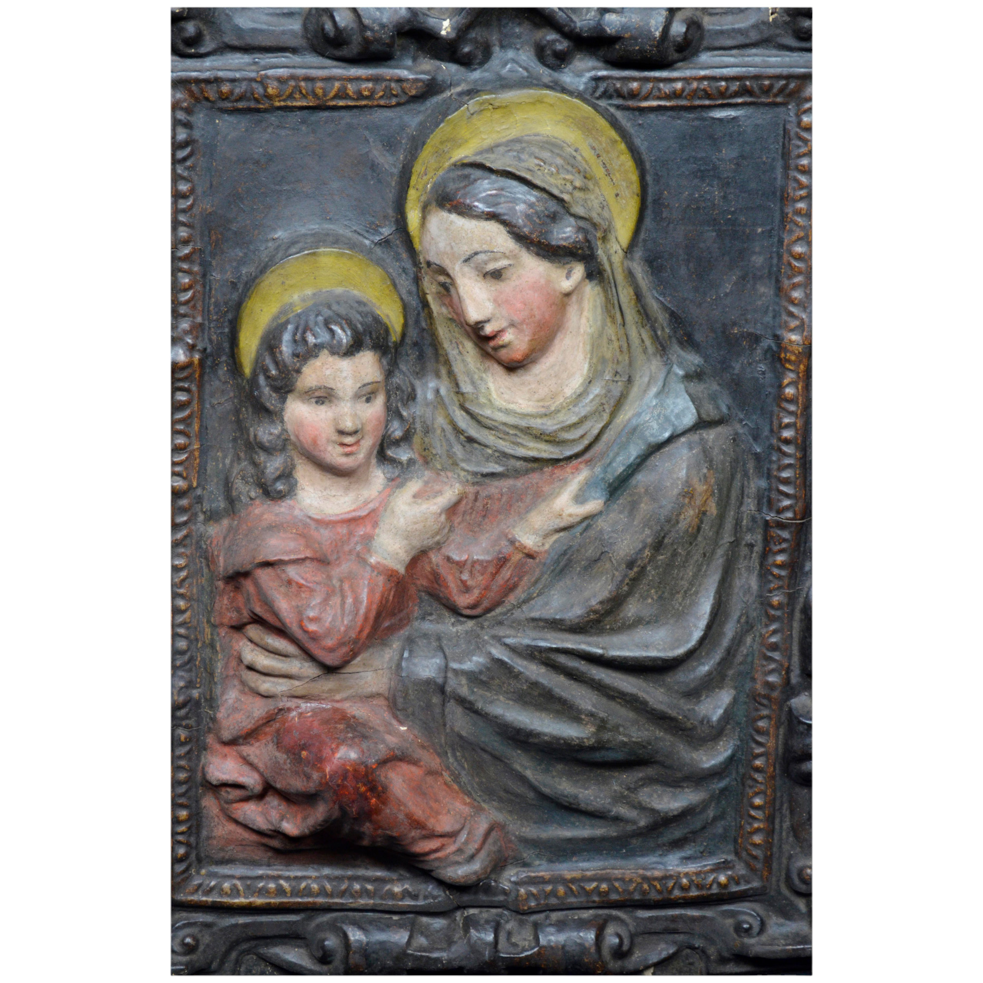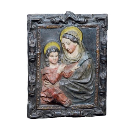 ALTORILIEVO in cartapesta policroma, raffigurante Sant'Anna con Maria bambina Italia XVII secolo h cm 80 x 63