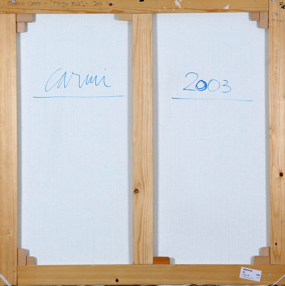 EUGENIO CARMI 1920 " Timido blu ", 2003 Olio su tela, cm. 100 x 100 Firmato e datato sul retro Autentica dell'artista su fotografia Prov. Collezione Privata