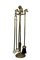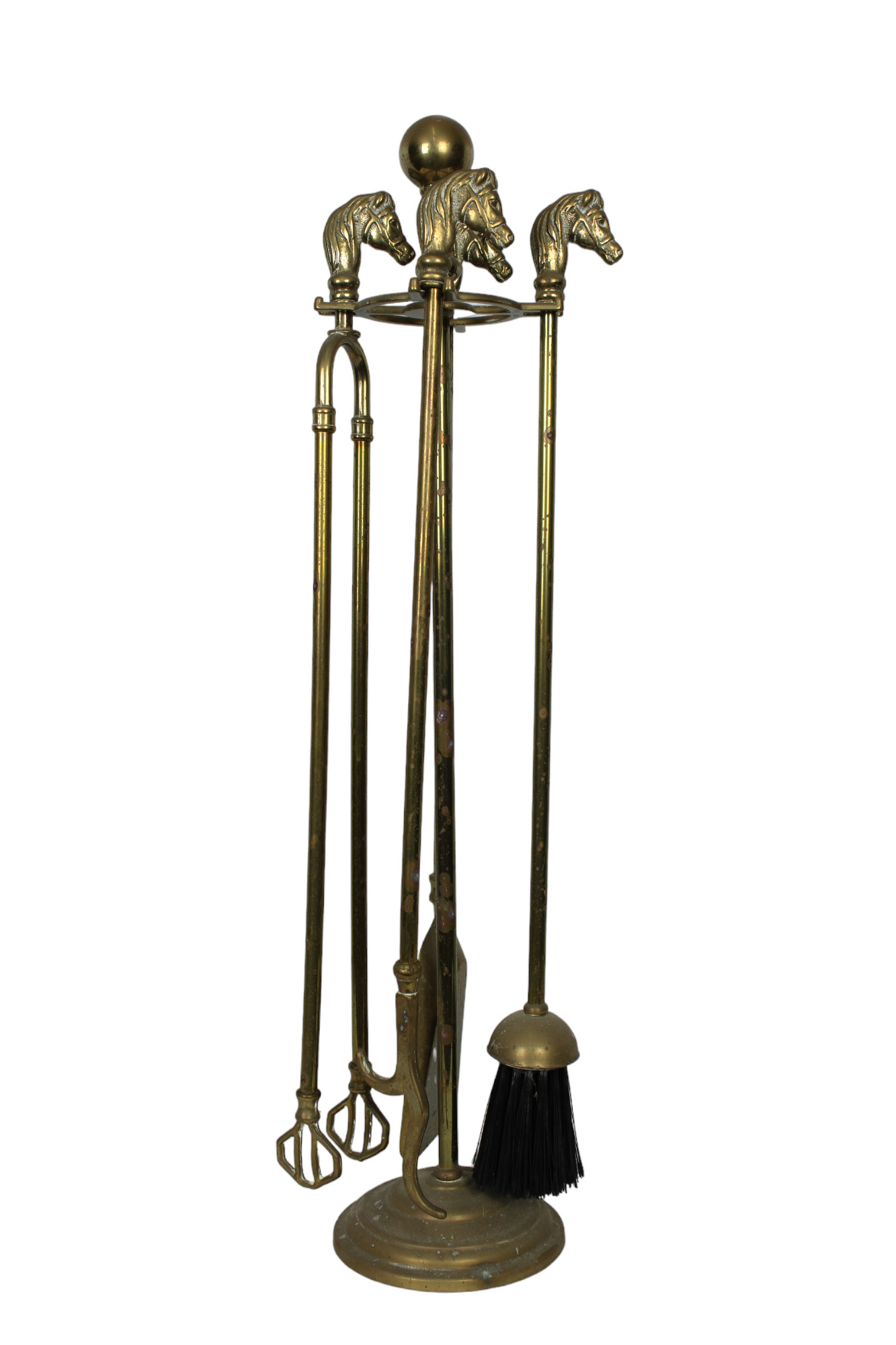 SET DA ATTREZZI DA CAMINO in ottone con manici raffiguranti teste di cavallo sostenute da base manifattura italiana prima meta del 900 h cm 67 x 15