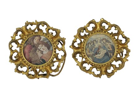 COPPIA DI PICCOLE CORNICI DI FORMA ROTONDA in legno traforato, finemente scolpito e dorato a oro zecchino maestranze fiorentine fine XIX secolo cm ø 19