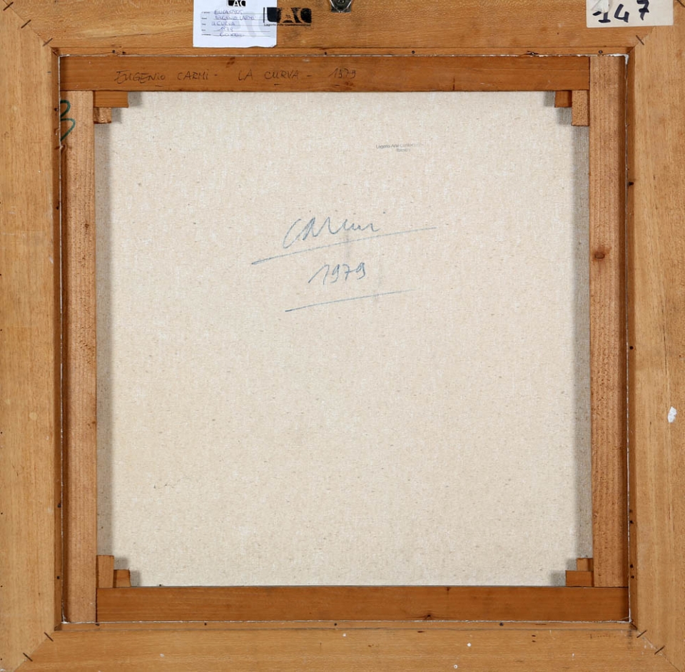 EUGENIO CARMI 1920 " La curva ", 1979 Olio su tela, cm. 60 x 60 Firmato e datato sul retro Etichetta e timbro Galleria Lagorio Arte Brescia, sul retro Prov. Collezione Privata