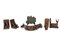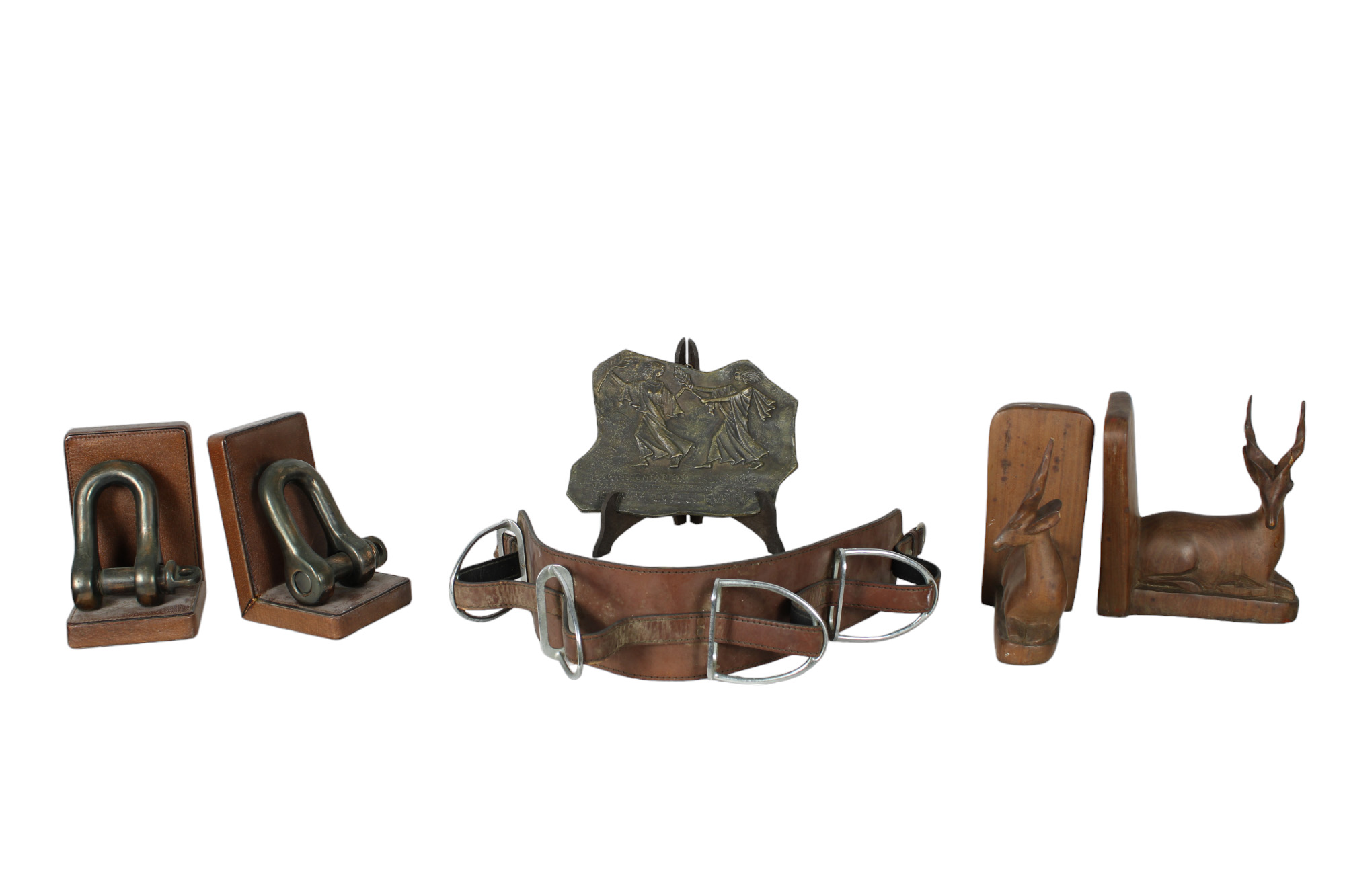 LOTTO COMPOSTO DA 2 ferma libri a motivo navale, 2 ferma libri raffigurante cervi, un porta tovagliette a motivo equestre e una placca in bronzo XX secolo misure varie