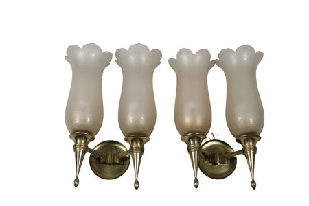 COPPIA DI APPLIQUES in metallo dorato e vetro satinato con lumeggiature in oro Italia primi 900 h cm 48 x 35 x 16