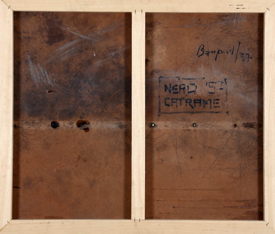 FRANCO BEMPORAD 1926 - 1989 " Nero catrame ", 1957 Catrame e stracci su tavola, cm. 79 x 93 Firmato e datato sul retro BIBLIOGRAFIA: " Franco Bemporad, dalla materia al segno ", Daniele Astrologo ed Elisabetta Bucciarelli, 2005, p. 28 Prov. Collezione Privata