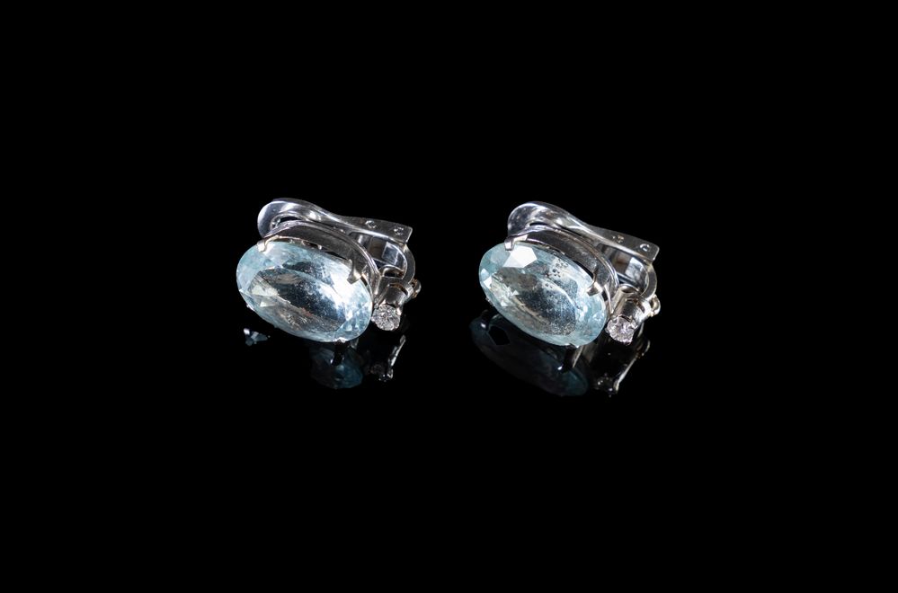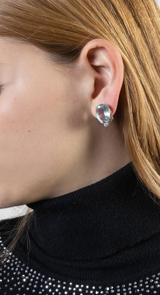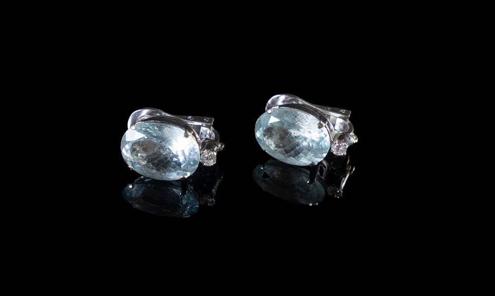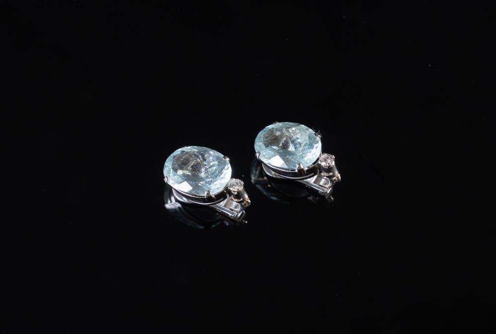 Coppia di orecchini in oro bianco 18k con acquamarine taglio ovale misto del peso totale stimato di ct. 15,90 sormontate da un diamante taglio brillante rotondo per un peso totale di ct. 0,20 totali