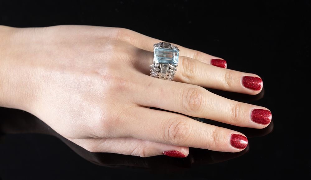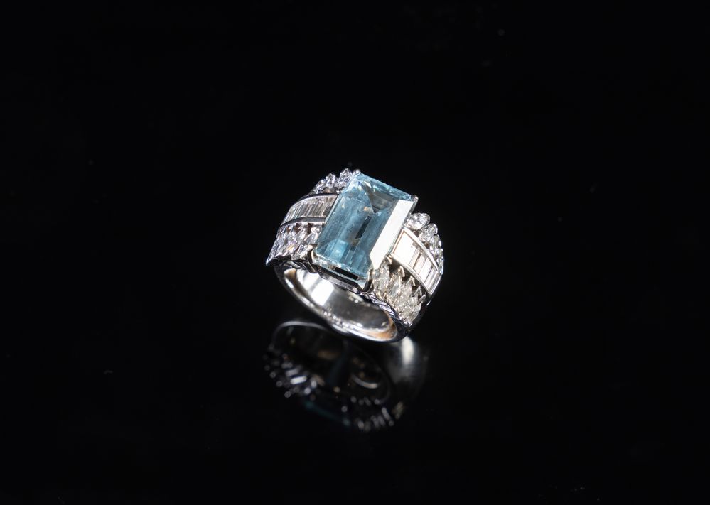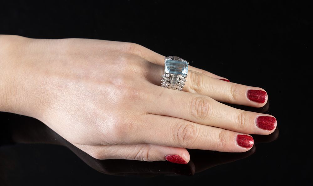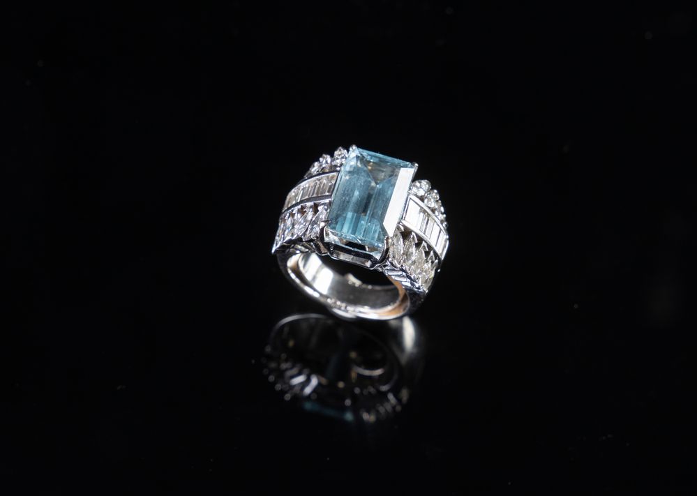 Anello in oro bianco 18k con acquamarina taglio rettangolare a gradini del peso stimato di ct. 8,30 e diamanti ai lati taglio marquise e taglio baguette per un peso totale stimato di ct. 1,80