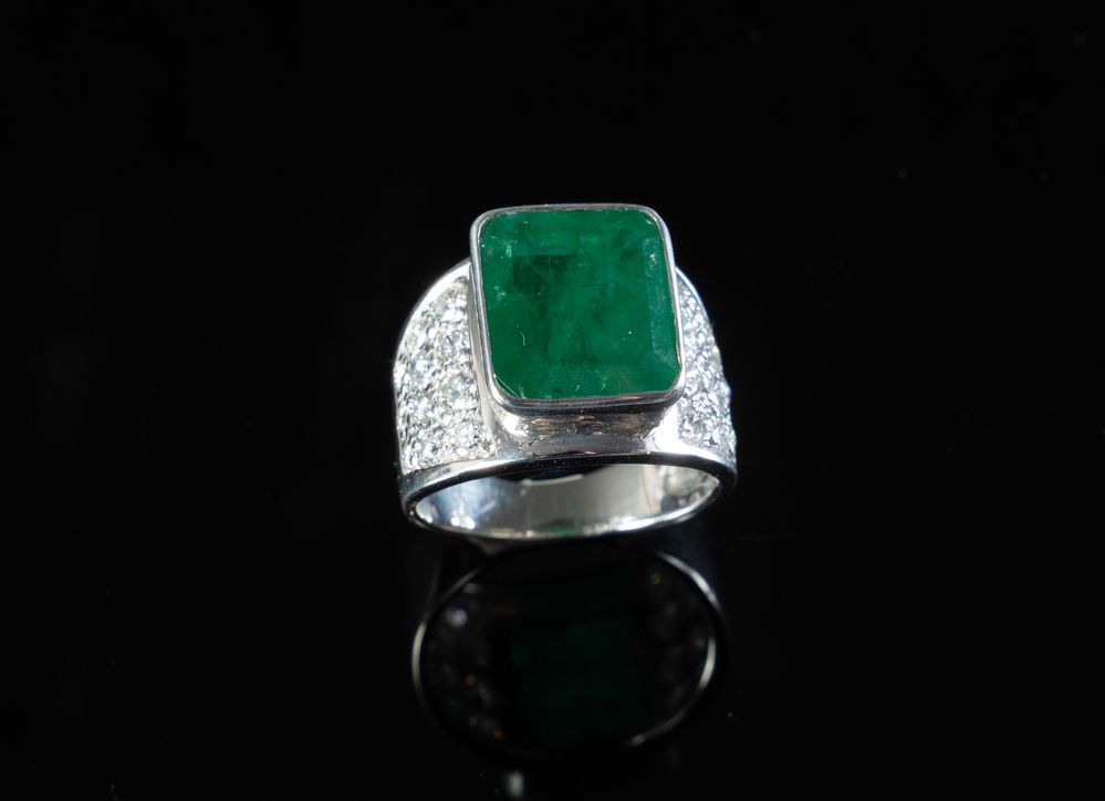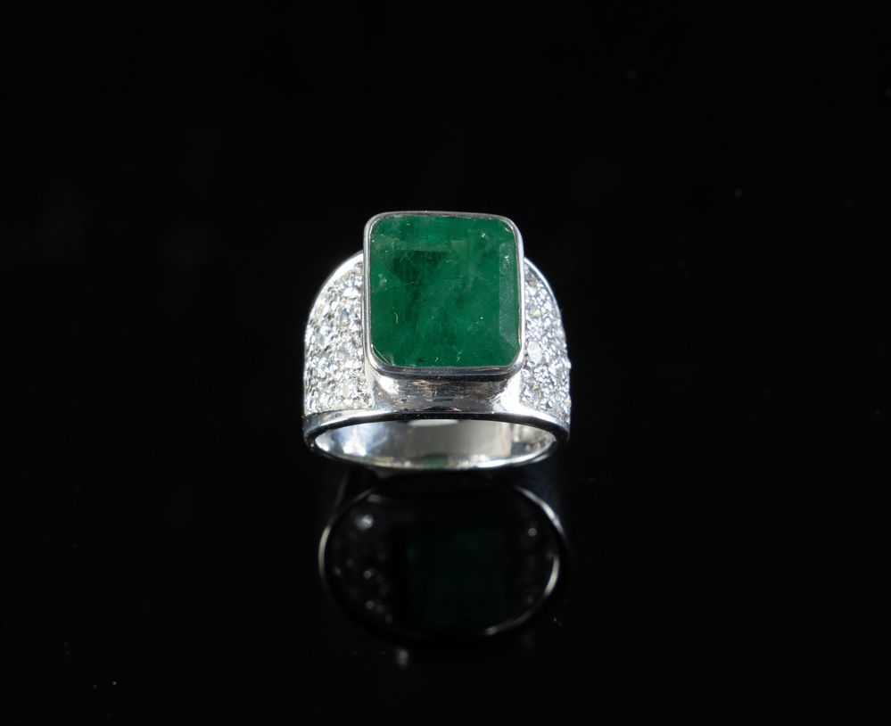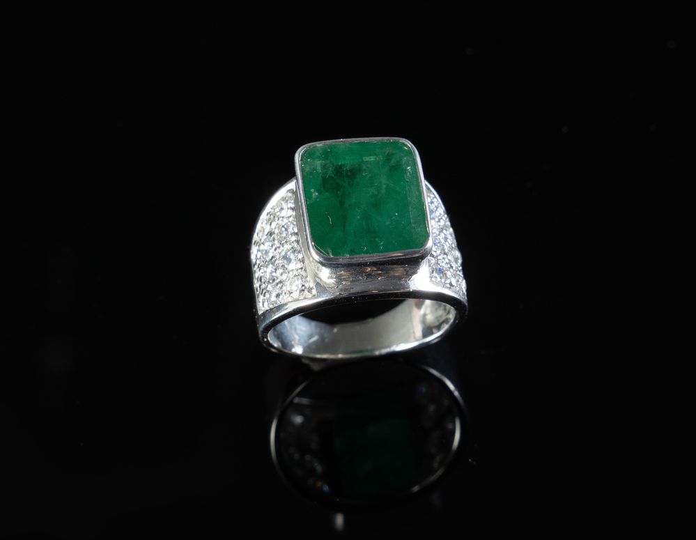 Anello in oro bianco 18k con smeraldo rettangolare e brillanti. Peso complessivo: 9,20 gr.
