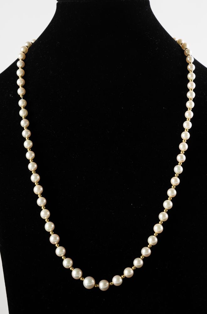 Collana di perle coltivate degradee dal calibro 9 al calibro 6 circa inframezzate da boule in oro giallo 18k – Fermezza in oro giallo 18k impreziosita da rubini naturali taglio brillante rotondo per un peso totale stimato di ct. 0,25.