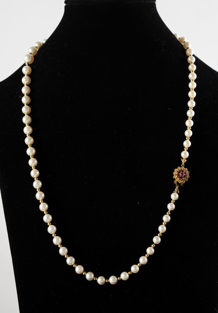 Lotto 54 | COLLANA DI PERLE COLTIVATE CON FERMEZZA IN ORO E RUBINI Collana di perle...