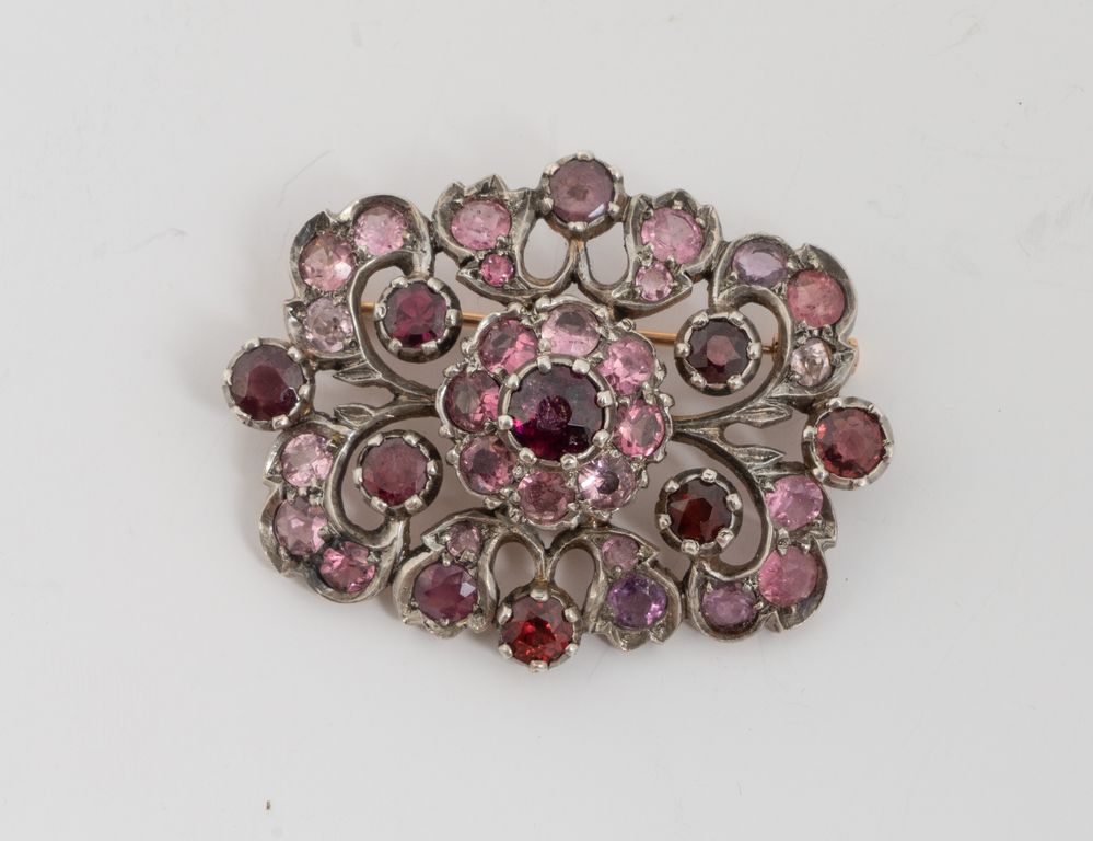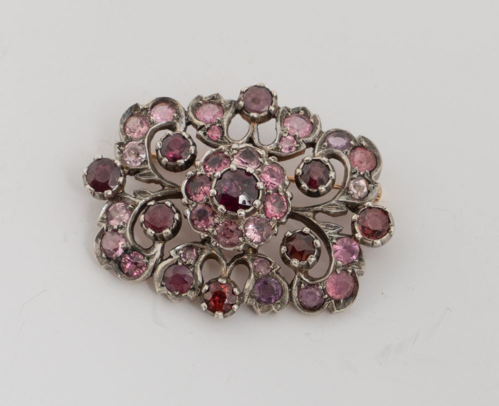 Realizzata in argento e oro a basso titolo seguendo un motivo floreale e vegetale, interamente decorata con granati e tormaline sfaccettate.