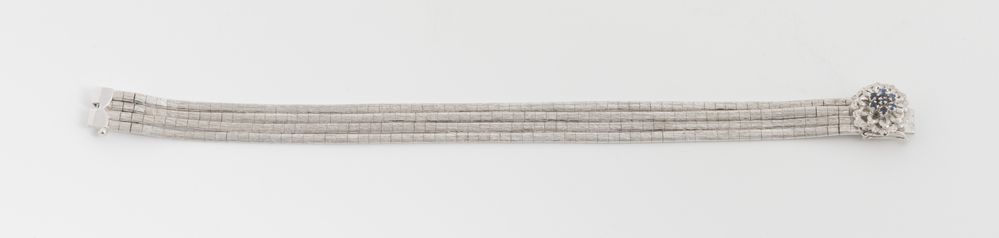 In oro bianco, realizzato a quattro file di maglie rettangolari incise e satinate, fermezza di foggia floreale arricchita da piccoli zaffiri blu.