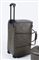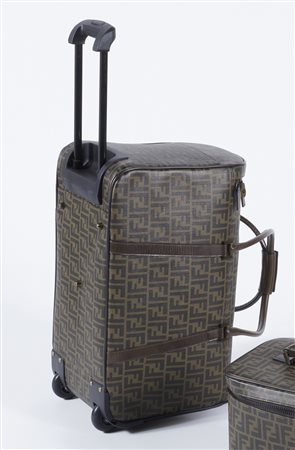 Elegante borsa a mano weekend in canvas Zucca, emblematico della Maison romana, con profili e dettagli in pelle marrone, linea morbida a bauletto, manici in pelle, ruote alla base per un comodo trasporto come trolley.