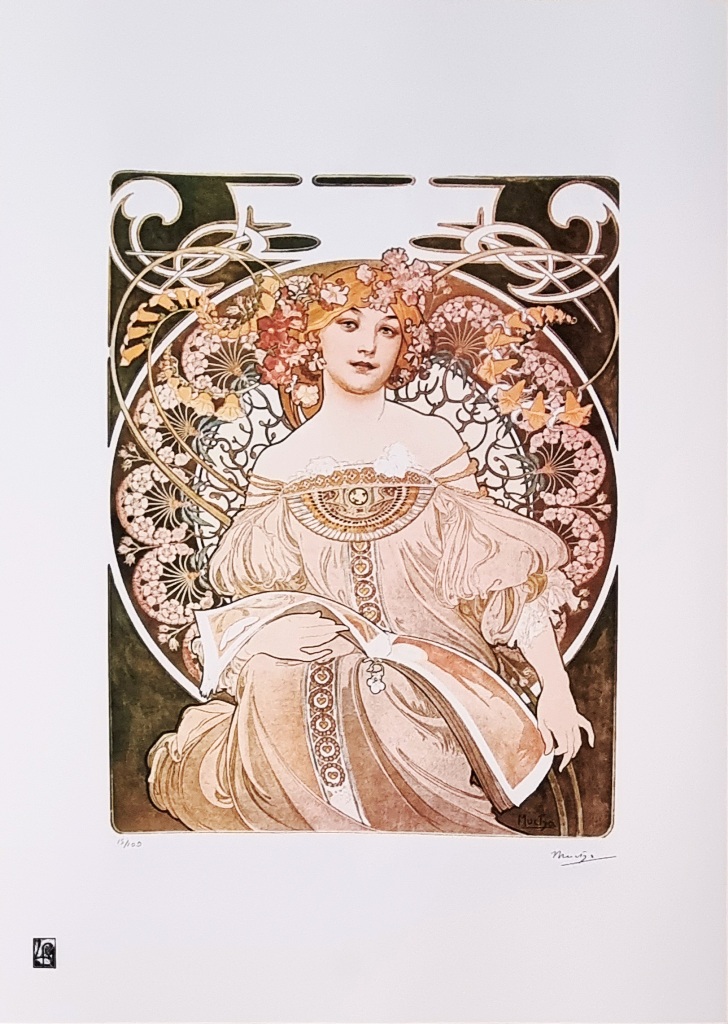 MUCHA ALPHONSE Ivančice 1860 - Praga 1939 "Senza titolo" Riproduzione litografica offset cm 50x70. Firmata in stampa sul fronte in basso a destra, tiratura 15/100 a sinistra e timbro in stampa. Sul retro ologramma di autenticità.