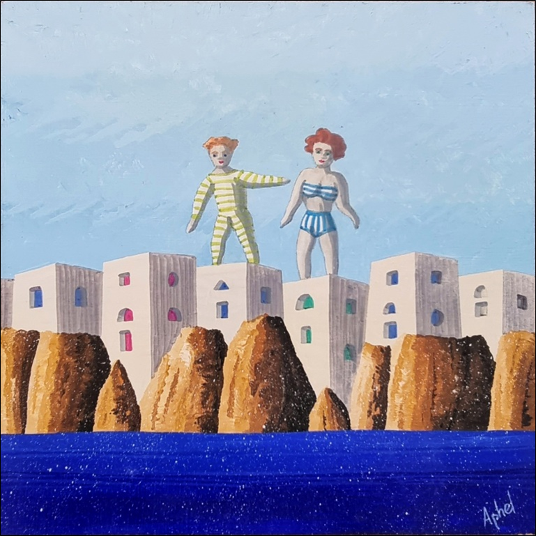 APHEL FABIO Cavalese (TN) 1957 "Lui e lei" Olio su tavola cm 25x25. Firmato sul fronte in basso a destra, sul retro titolo, firma e numero d'archivio.