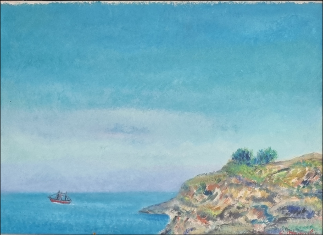 OMICCIOLI GIOVANNI Roma 1901 - 1975 "Peschereccio all'alba a Santa Cesarea" Olio su cartone pressato cm 50x37. Firmato sul fronte in basso a destra. Sul retro titolo, firma, timbro della Galleria Il Poliedro e dichiarazione di autenticità dell'artista.