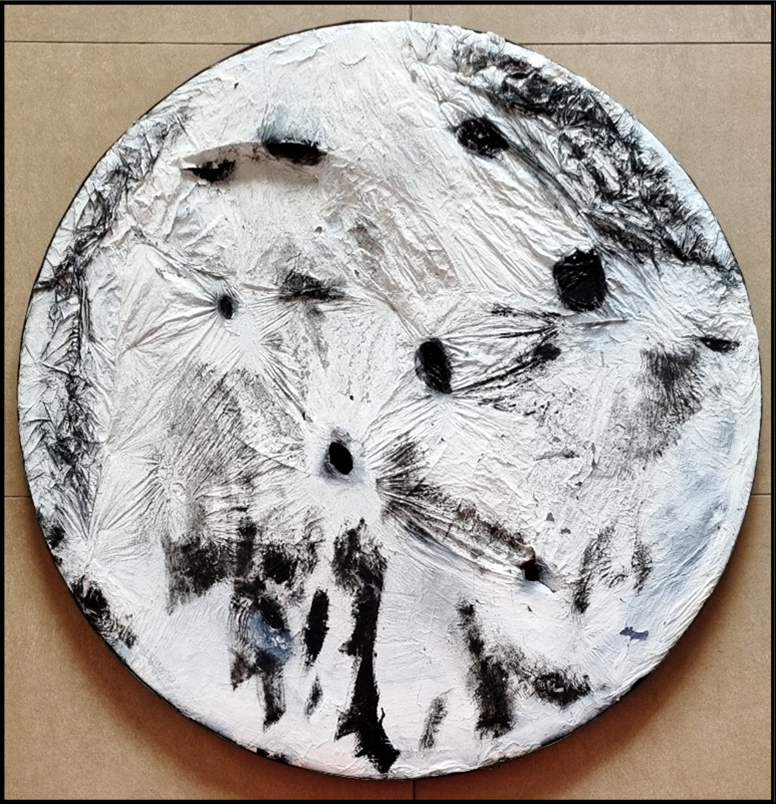 CROTTI DALILA Italia 1983 "Burnt 12" Acrilico su plastica e pelle, cm 100 di diametro, del 2015. Sul retro firma, data, tecnica, misure ed archiviazione a cura dell'artista. Archivio su foto a cura dell'artista.
