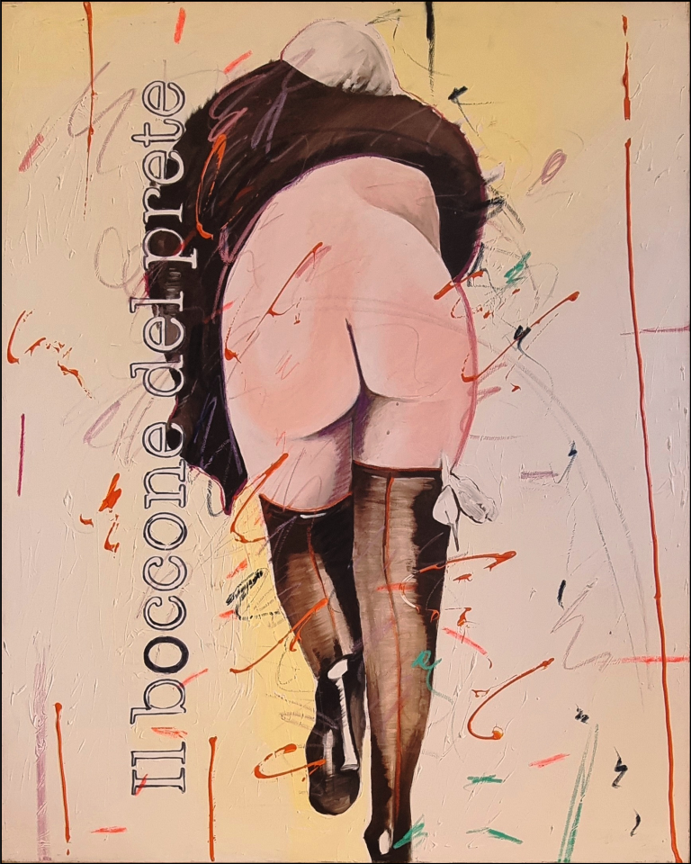 MANERA ENRICO Asmara 1947 "Il boccone del prete" Olio e tecnica mista su tela cm 80x100, del 2003. Intitolato sul fronte, al verso firma, data e numero d'archivio. Autentica su foto a cura dell'artista.