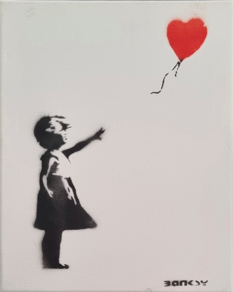 BANKSY Regno Unito XX sec. "Banksy per Dismaland" Vernice spray su tela cm 24x30, del 2015. Firmata sul fronte in basso a destra. Sul retro tiratura 8/15 e timbro Dismaland. Opera accompagnata da biglietto di ingresso al parco e certificato di originalità di Dismaland.
