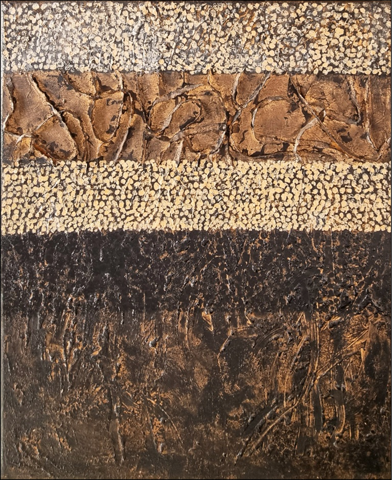 PISANI FRANCA Grosseto 1956 "Minuta ricerca" Ossidi e foglia oro su tela, cm 90x110 del 2006. Sul retro titolo, data, tecnica, misura e luogo. Autentica su foto e certificato di autenticità di altra casa d'aste.