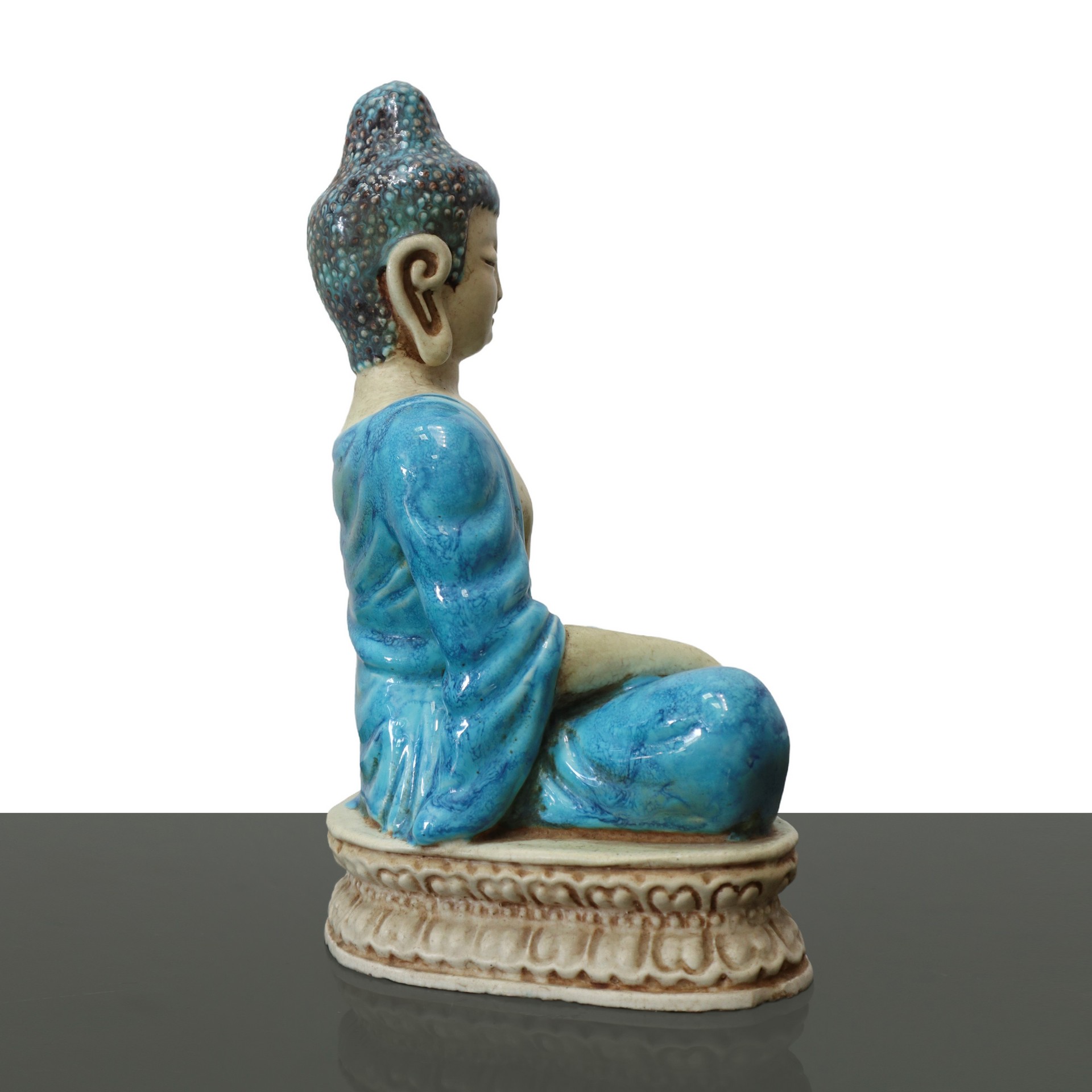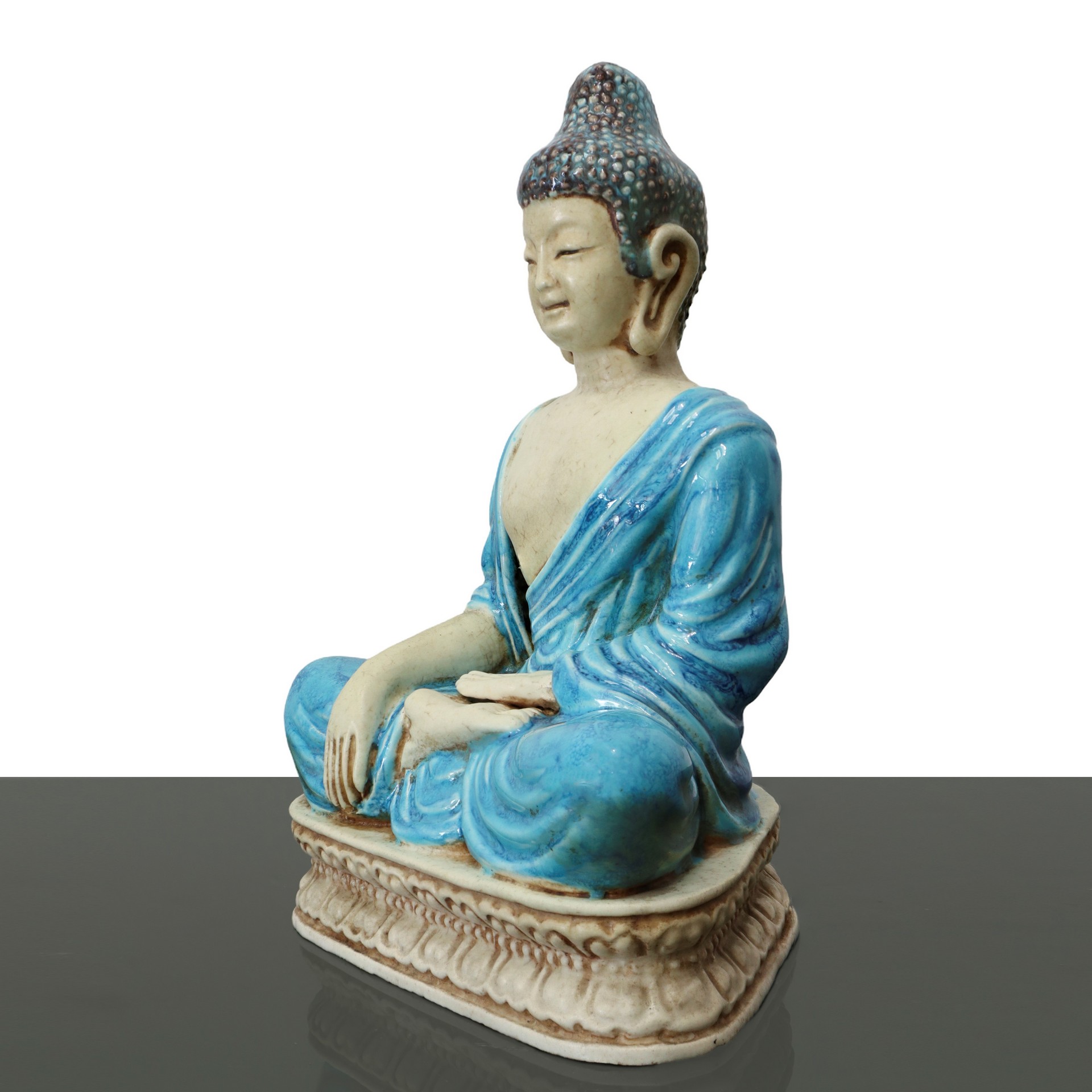 Buddha in ceramica smaltata nei colori del bianco e dell'azzurro