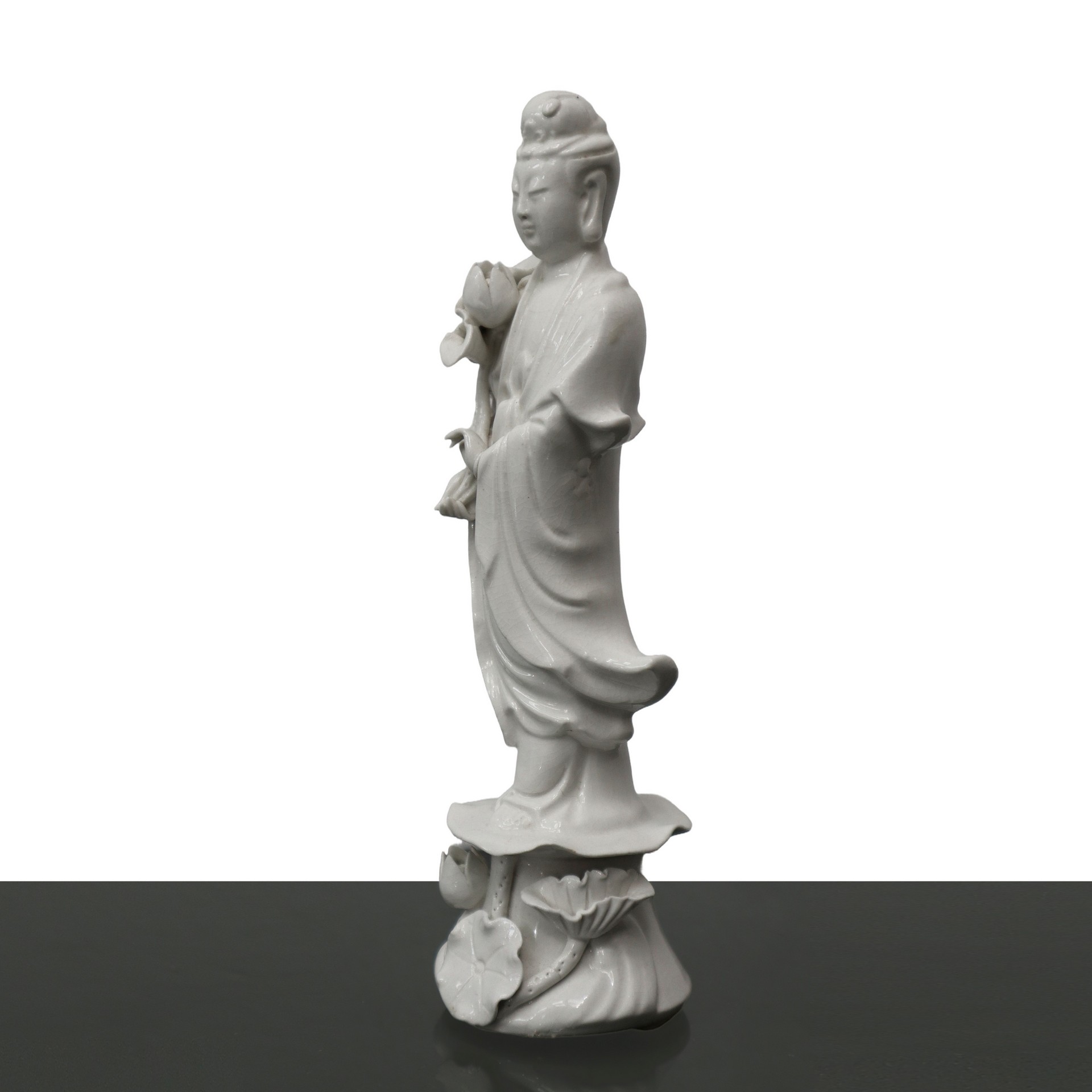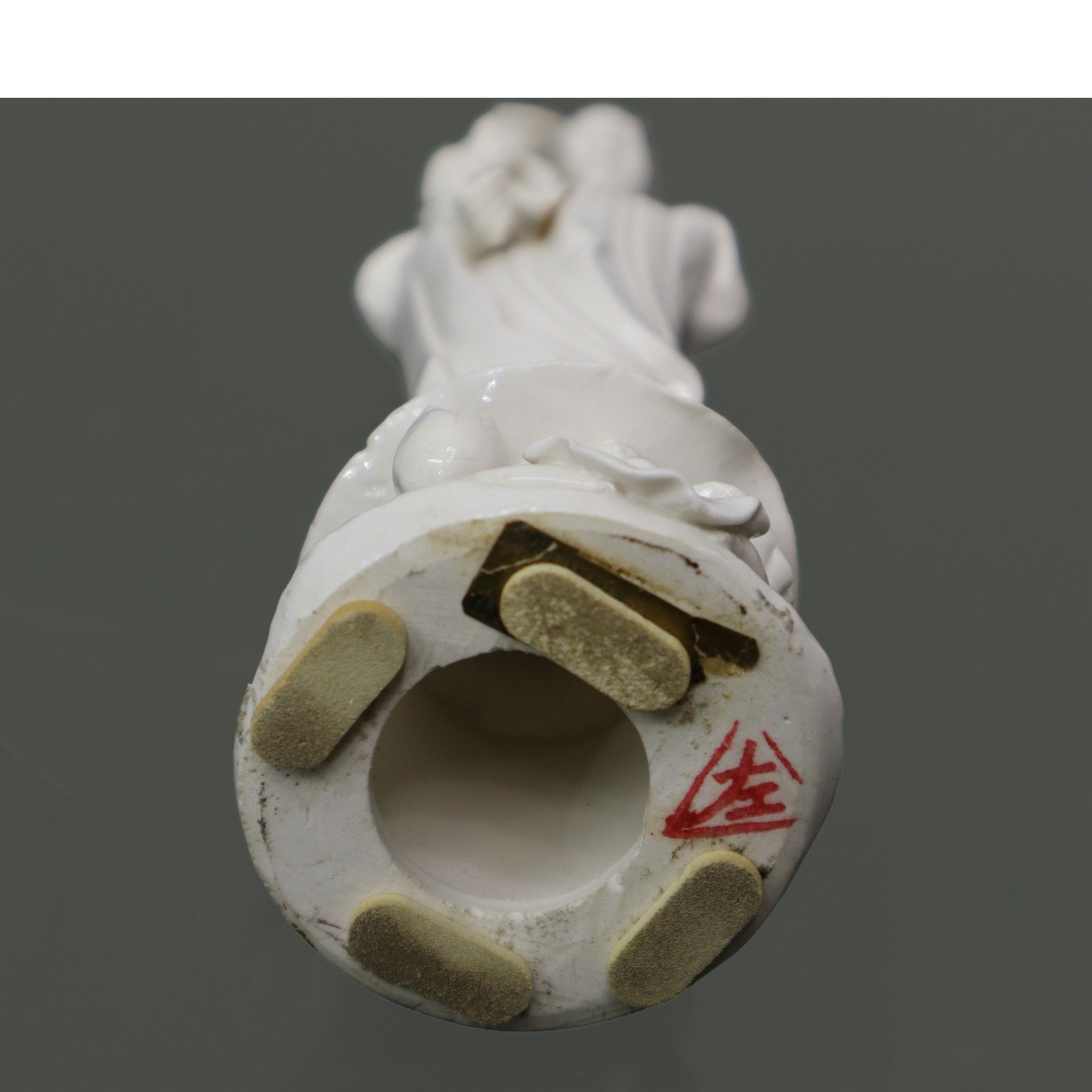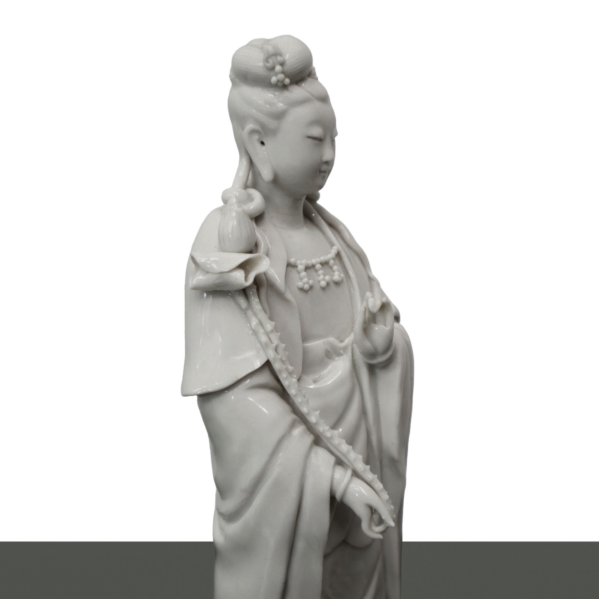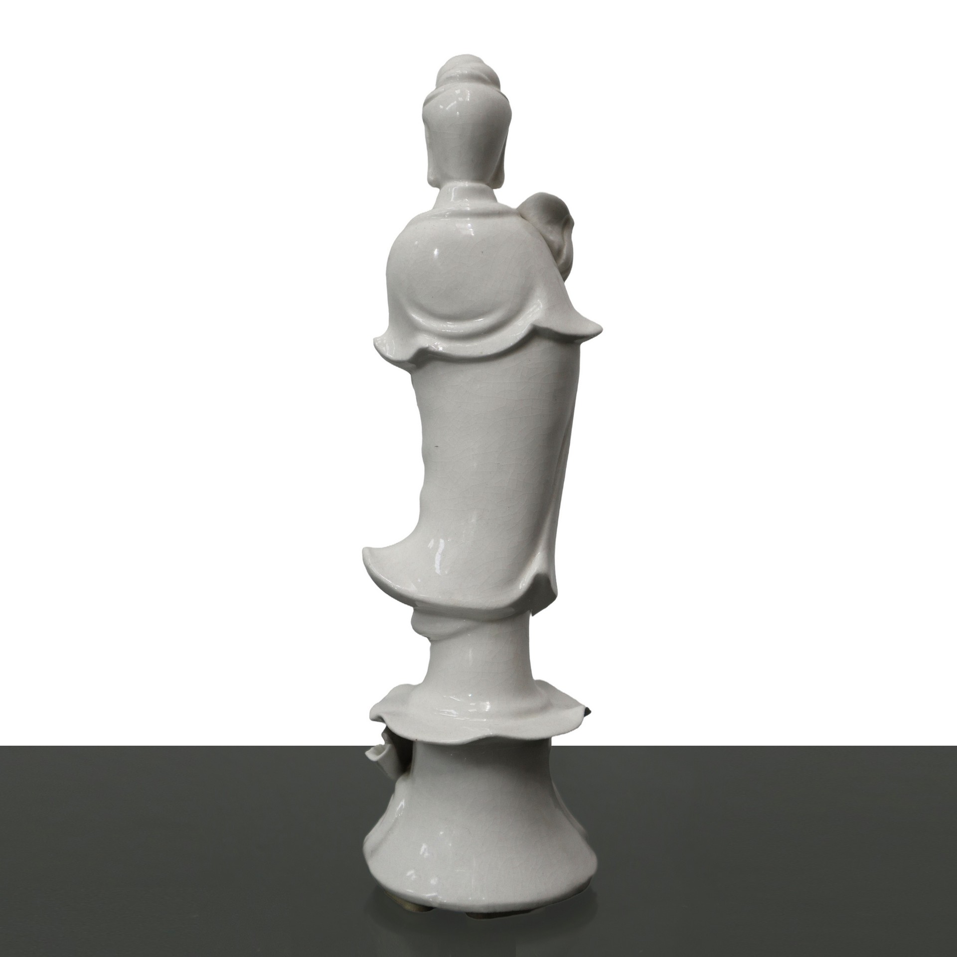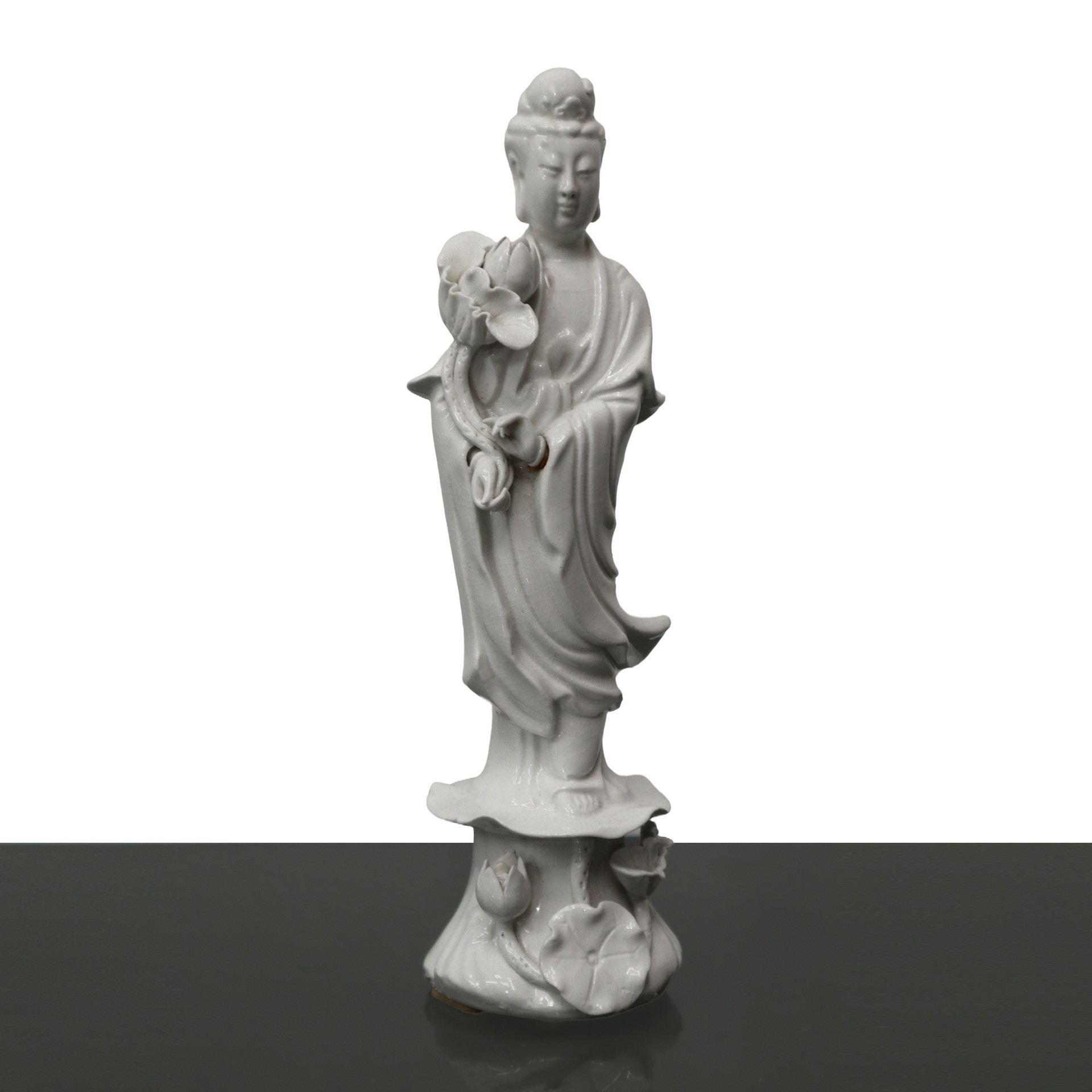 Tre statuine cinesi in porcellana bianca che raffigurano Guanyin H cm 22.5x8 Tre statuine in porcellana bianca cinese che raffigurano Guanyin, la dea marina della misericordia. Le statuine hanno tre misure diverse. La più grande ha slcune dita scheggiate e ha inciso il numero 44 al suo interno. La statuina di medie dimensioni ha un carattere cinese in colore rosso alla base. Tre statuine in porcellana bianca cinese che raffigurano Guanyin, la dea marina della misericordia. Le statuine hanno tre misure diverse. La più grande ha slcune dita scheggiate e ha inciso il numero 44 al suo interno. La statuina di medie dimensioni ha un carattere cinese in colore rosso alla base.
