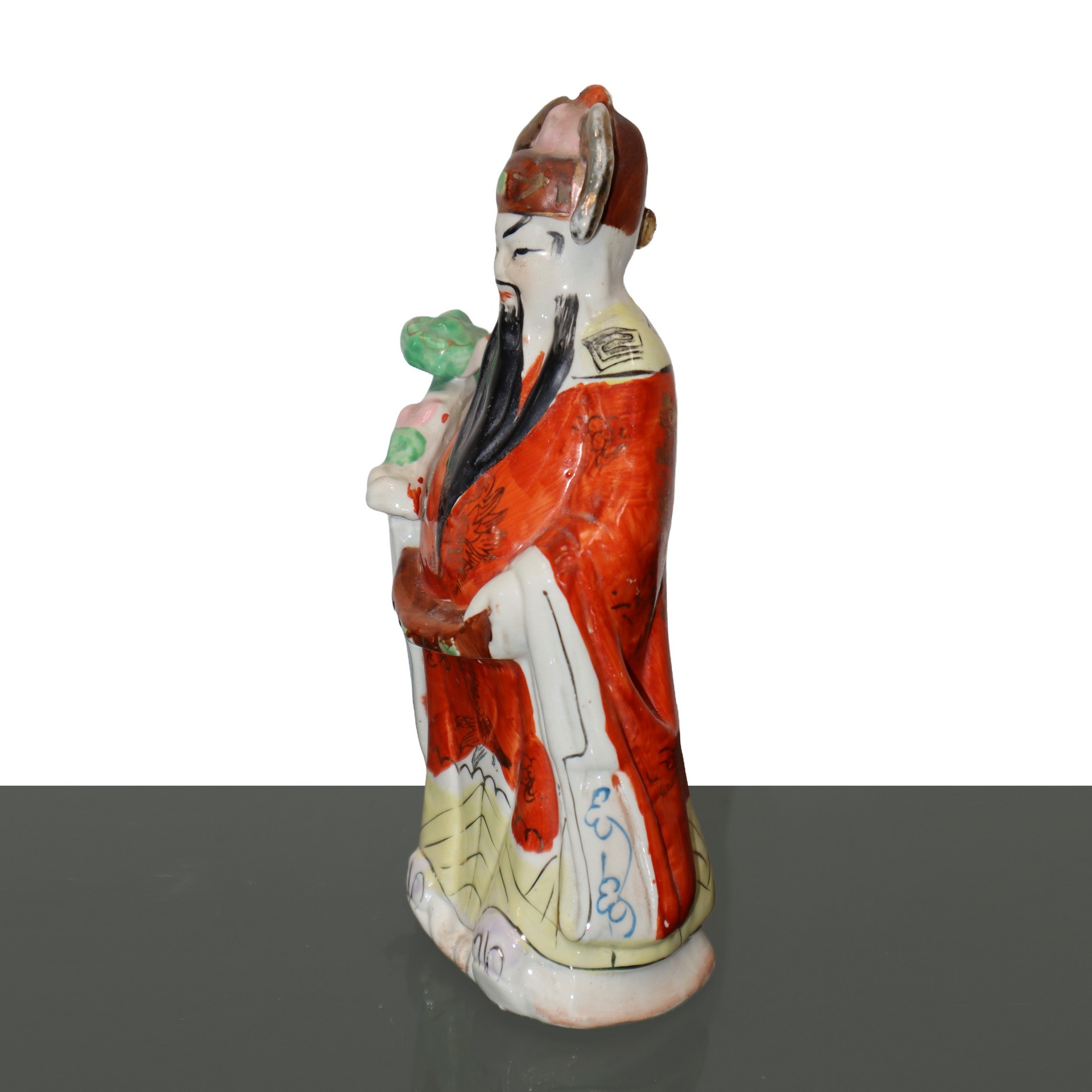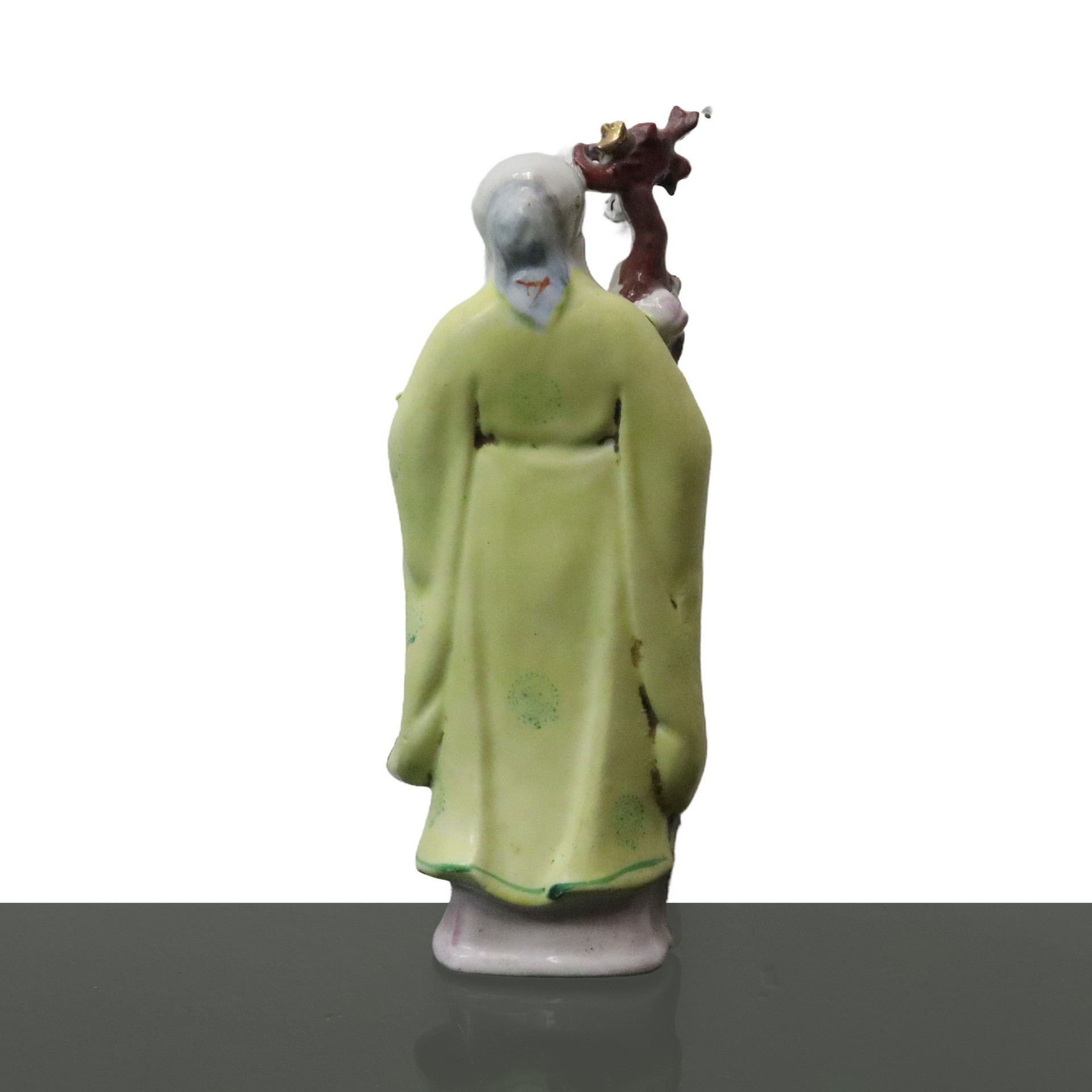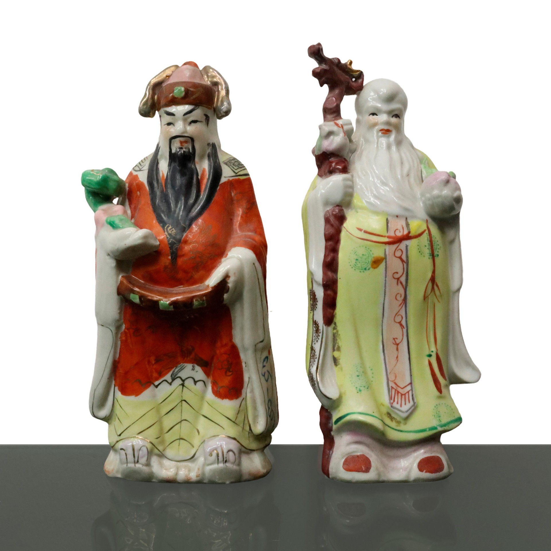 Coppia di statuette cinesi in porcellana H cm 20.3x9.5 Coppia di statuette cinesi in porcellana dipinte a mano. Raffigurano due uomini in abiti tradizionali cinesi che reggono con le mani un ramo fiorito e un bastone dalla forma di dragone. Carattere cinese presente in entrambe le basi.Coppia di statuette cinesi in porcellana dipinte a mano. Raffigurano due uomini in abiti tradizionali cinesi che reggono con le mani un ramo fiorito e un bastone dalla forma di dragone. Carattere cinese presente in entrambe le basi.