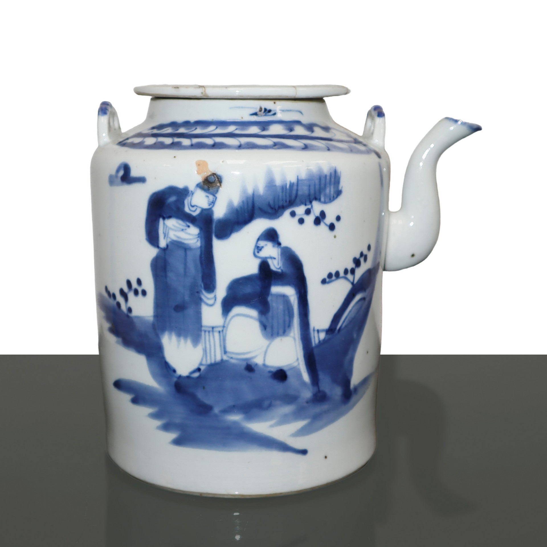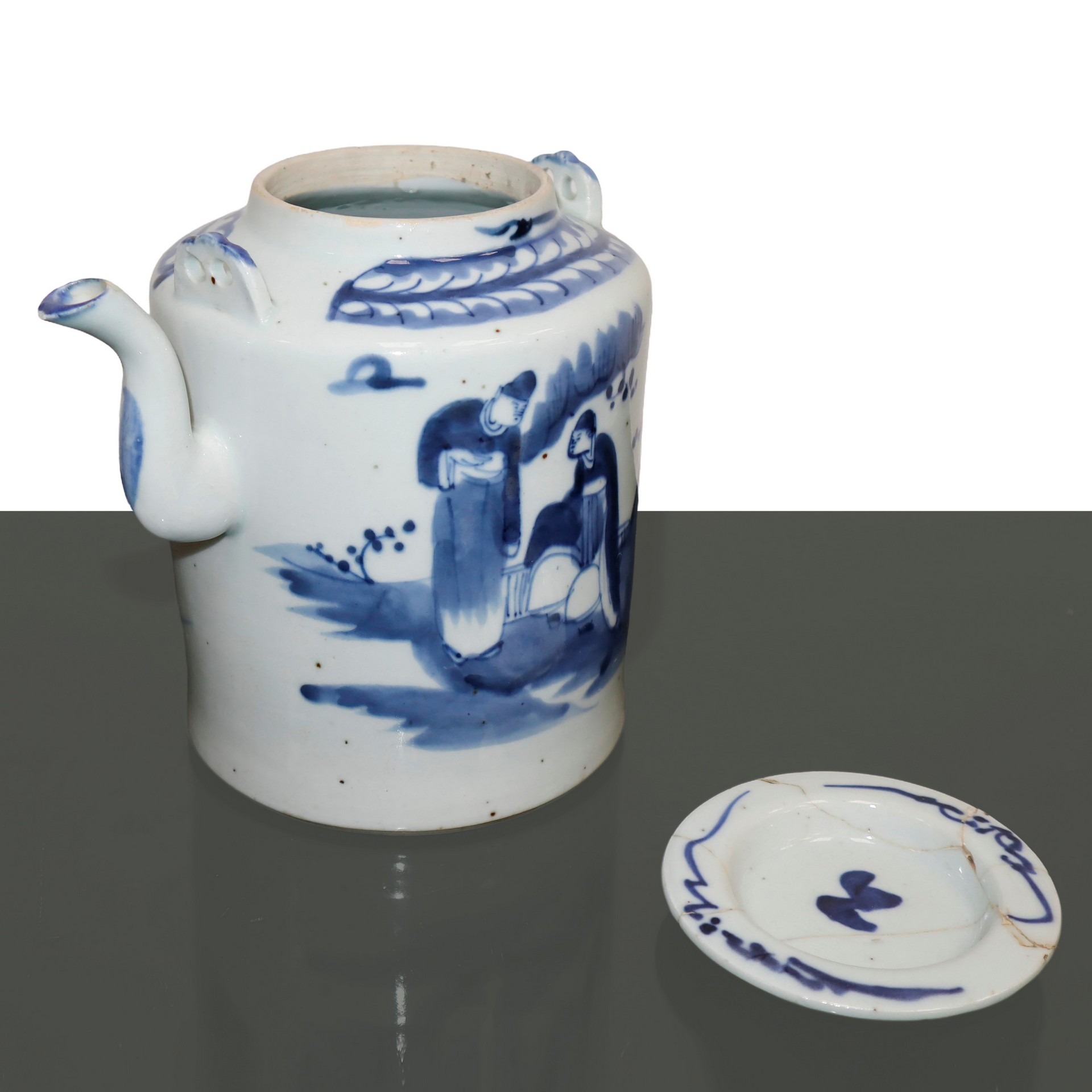 Caffettiera in porcellana cinese dipinta blu su fondo bianco, Fine 19° secolo cm 18 Coperchio restauratoCoperchio restaurato