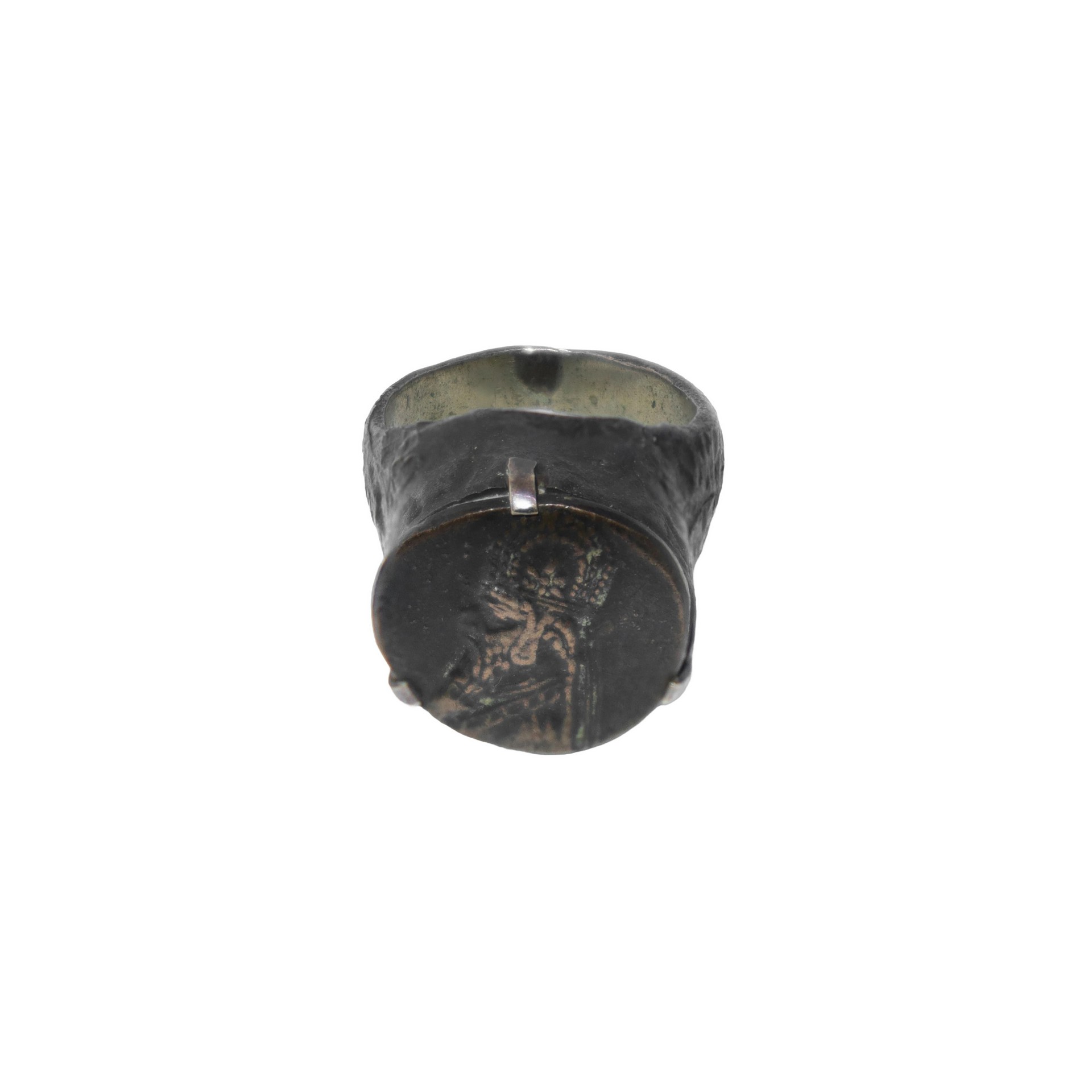 Anello in argento con moneta incastonata H cm 3x2.5 Anello in argento con superficie sbalzata e moneta incastonata raffigurante il volto di un uomo di profilo.Anello in argento con superficie sbalzata e moneta incastonata raffigurante il volto di un uomo di profilo.