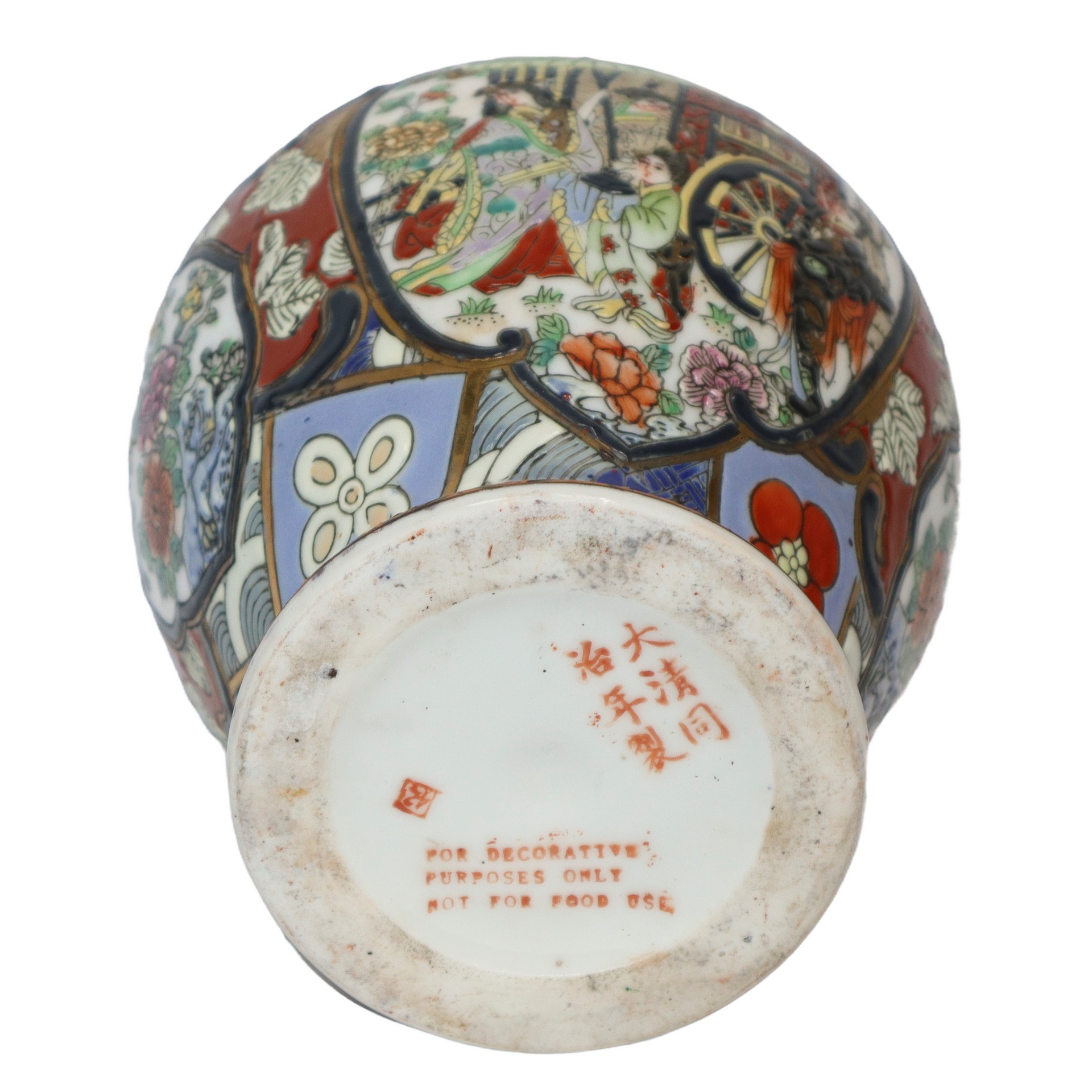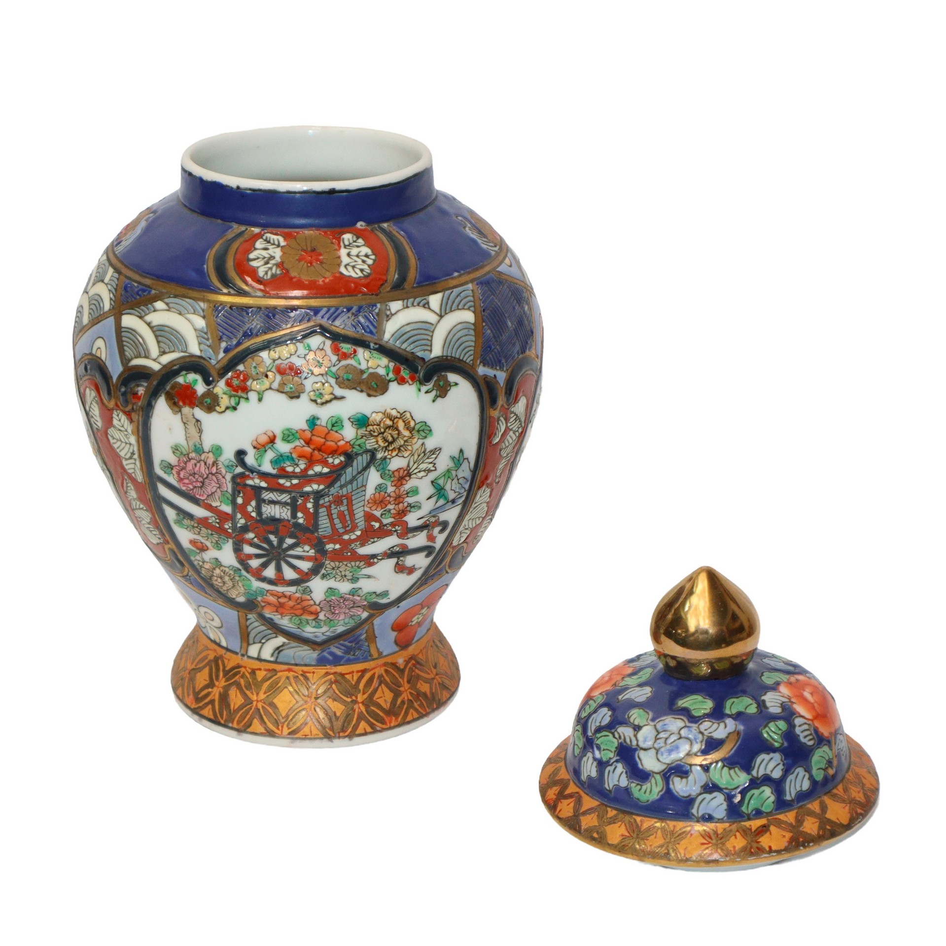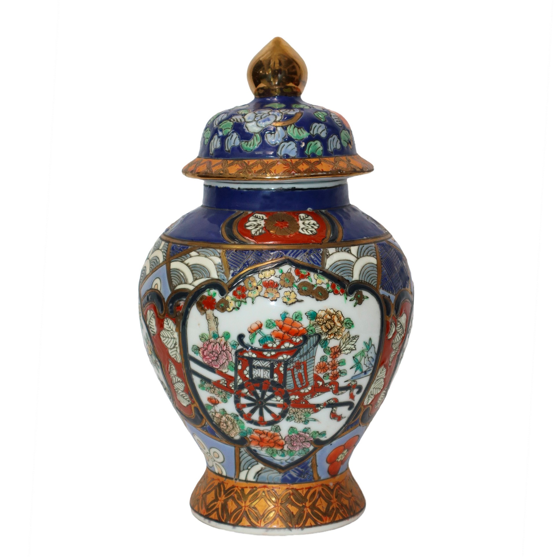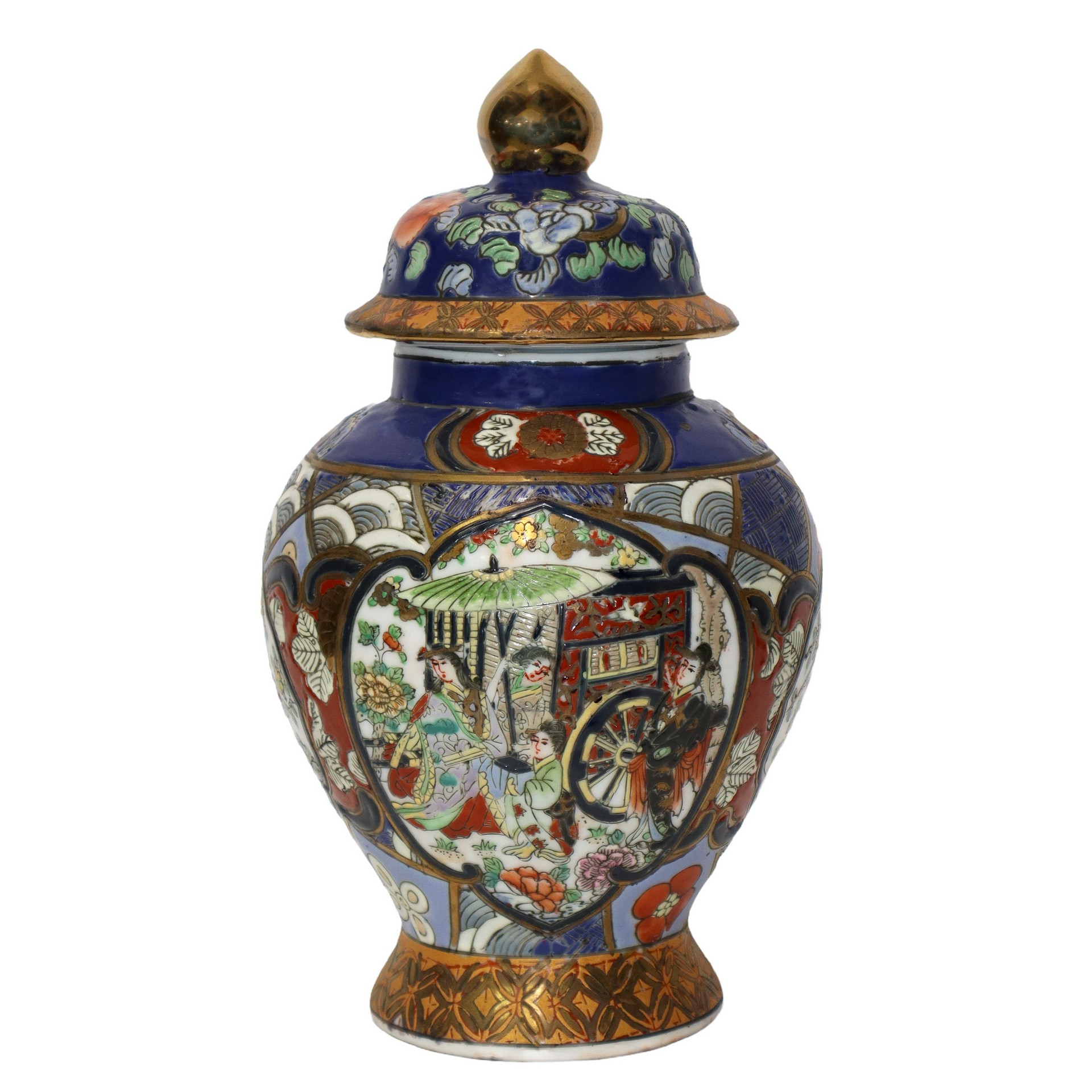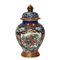Vaso potiche Giapponese, Satsuma policromo con coperchio con base in legno