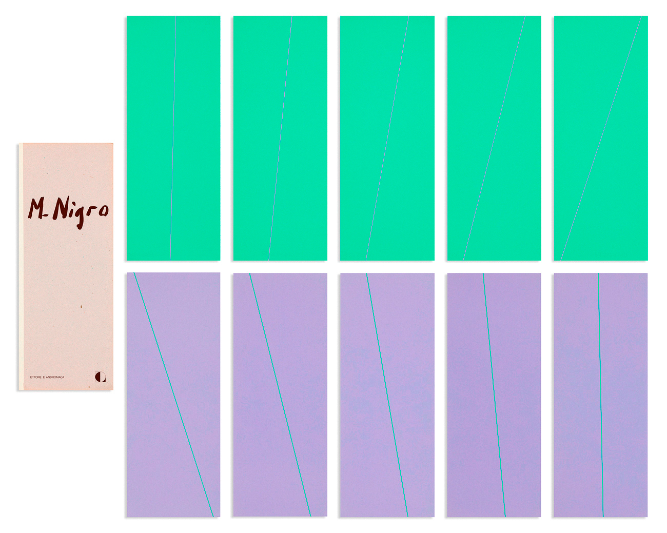 Cartella contenente colophon di presentazione recante testo di Luciano Caramel e 10 serigrafie su cartoncino, ciascuna recante firma e numerazione (Esemplari 27/100) a matita al retro