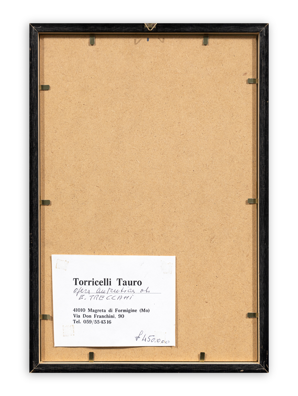 Etichetta della Collezione Tauro Torricelli (MO) al retro della tavola protettiva