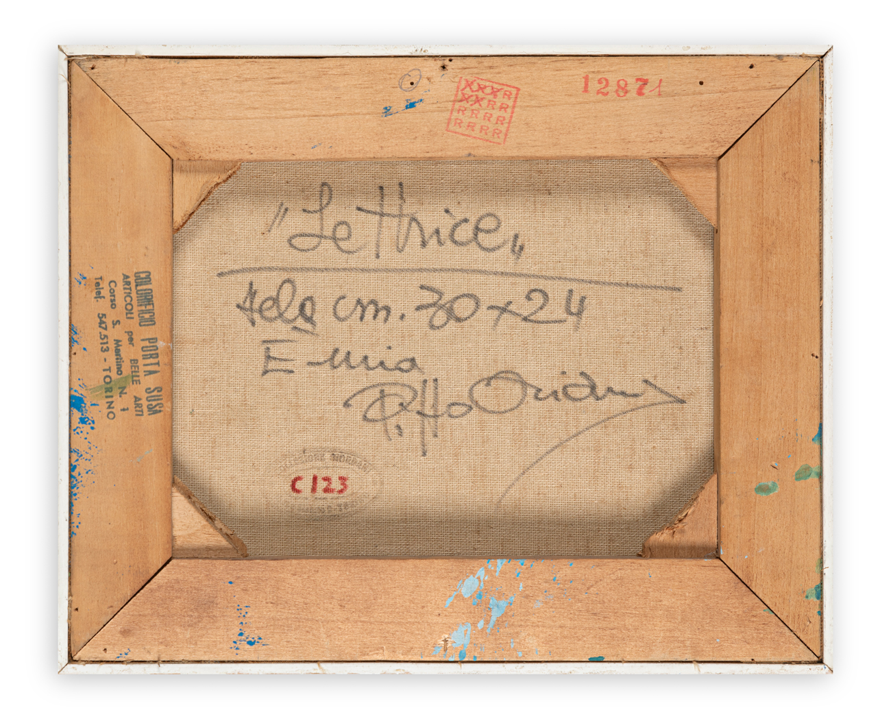 Firma, tecnica, misure e dichiarazione di autenticità dell'Artista al retro
