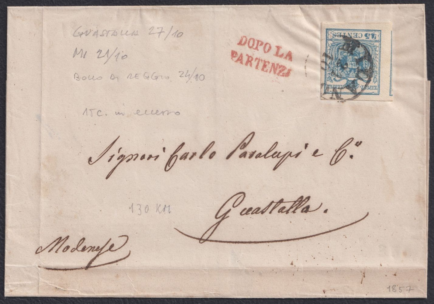 1857 - Busta da Milano per Guestalla affrancata tramite un 45 cent. azzurro n.22. (LUX).