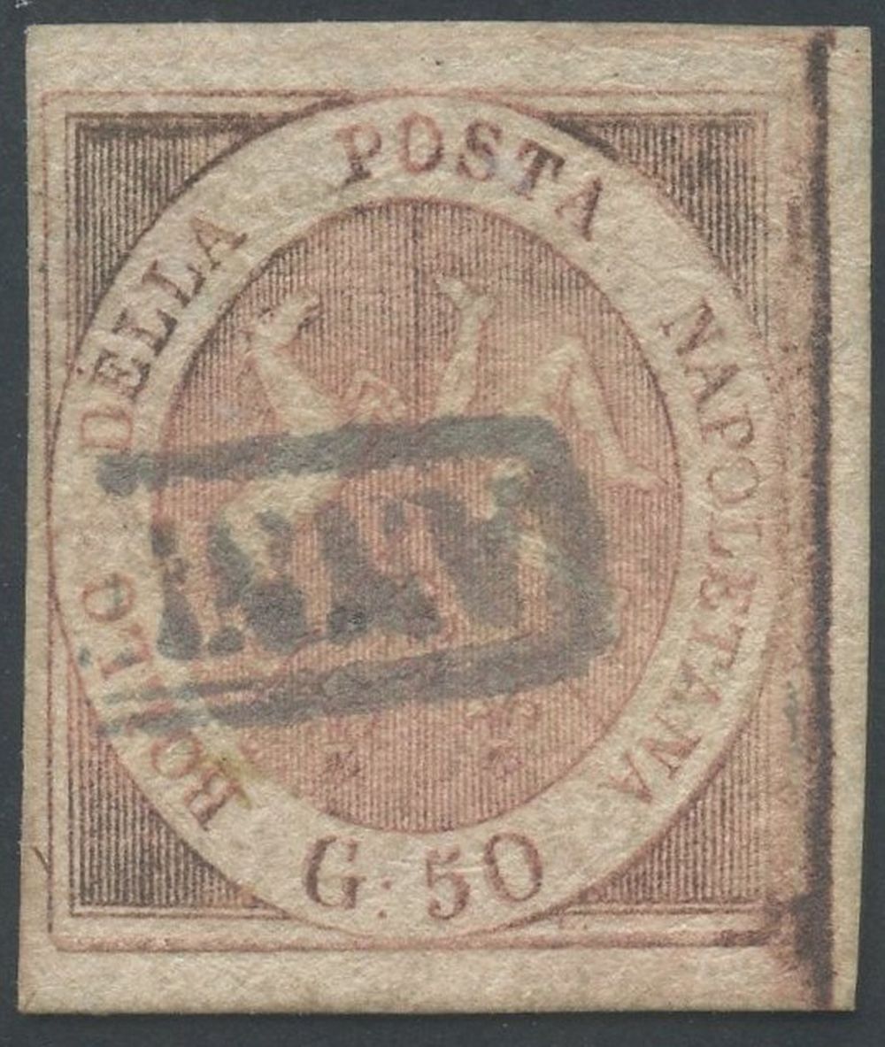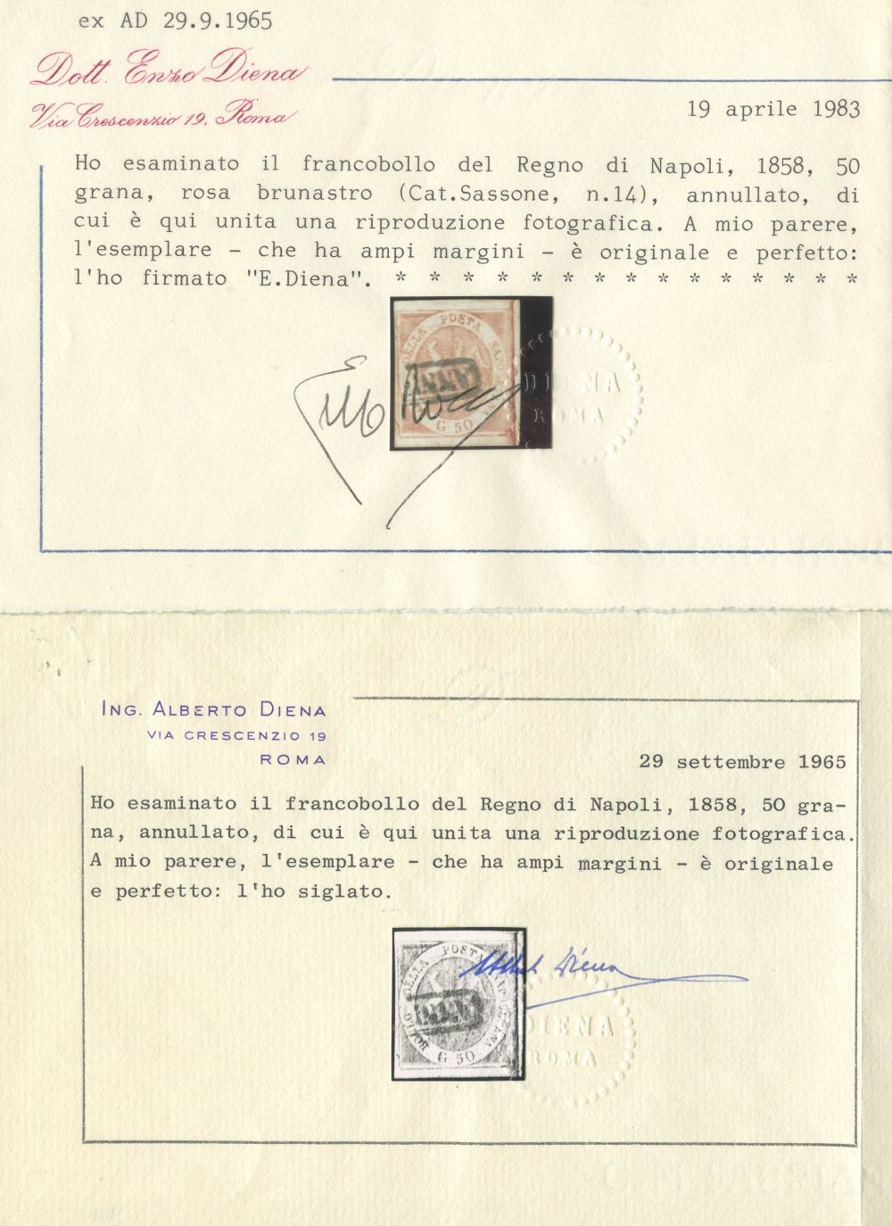 1858 - 50 grana rosa brunastro n. 14 usato. (A+) (cert. Alberto Diena, cert. Enzo Diena, Chiavarello)