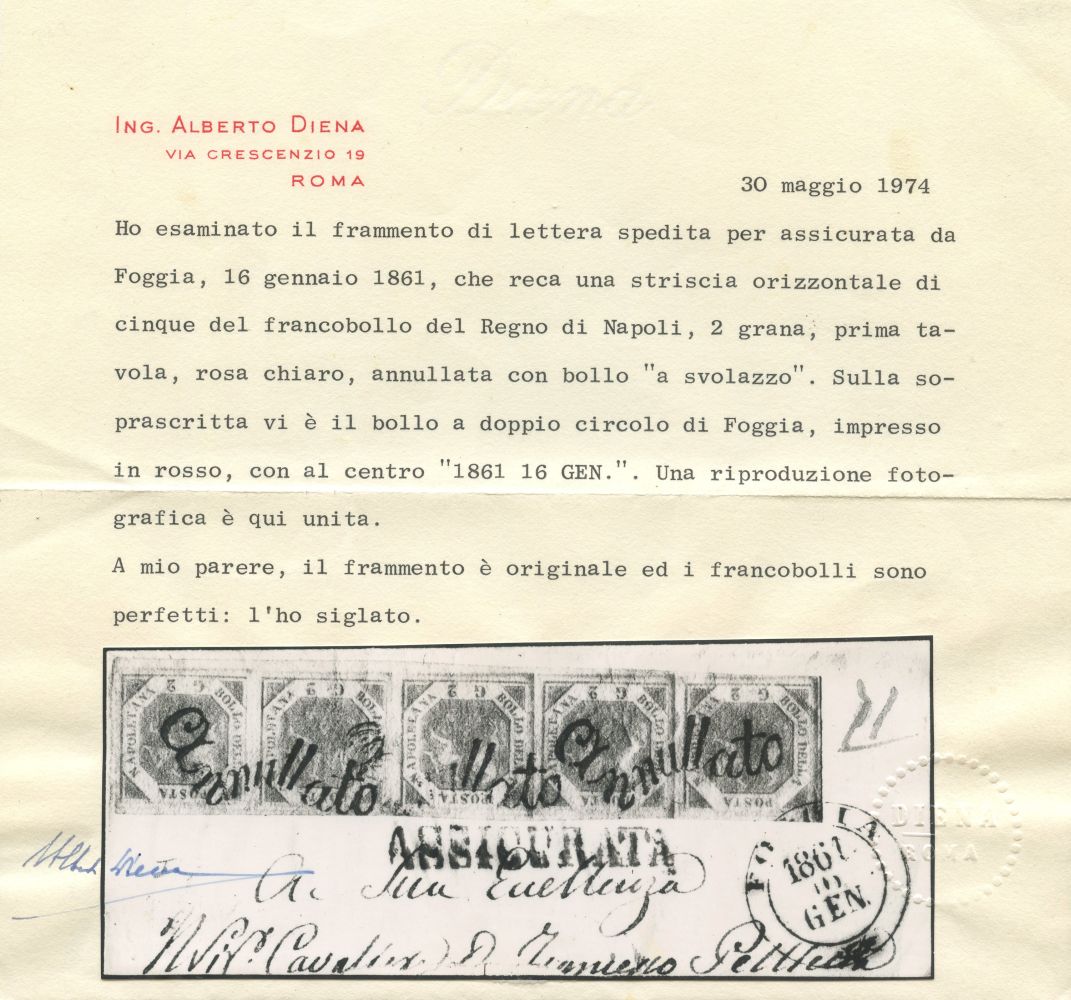 05.01.1861 - Frammento di lettera assicurata spedita da Foggia ed affrancata tramite una striscia di cinque del 2gr. rosa chiaro n.5. Sull'affrancatura lo svolazzo tipo 16 di FOGGIA (7pt.). Splendido e raro insieme. (LUX) (Cert. storico di Alberto Diena)