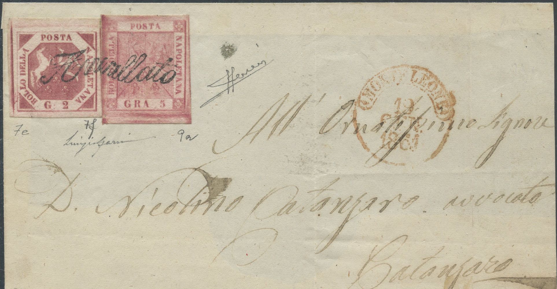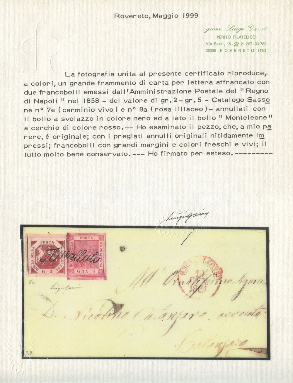 19.10.1861 - Fronte di lettera affrancata per 7 grana tramite un 2gr. carminio vivo n.7e + 5gr. rosa lillaceo n.8a, sull'affrancatura lo svolazzo tipo 29 di MONTELEONE (pt.10), splendido insieme non comune. (LUX) (Sorani, Cert. Luigi Gazzi)