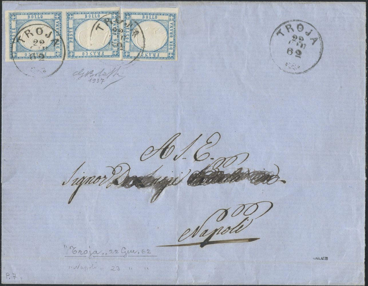 22.06.1862 - Lettera da Troja per Napoli affrancata per 6 grana tramite tre valori (una coppia più singolo) del 2gr. azzurro chiaro n.20. (A+) (Bolaffi)