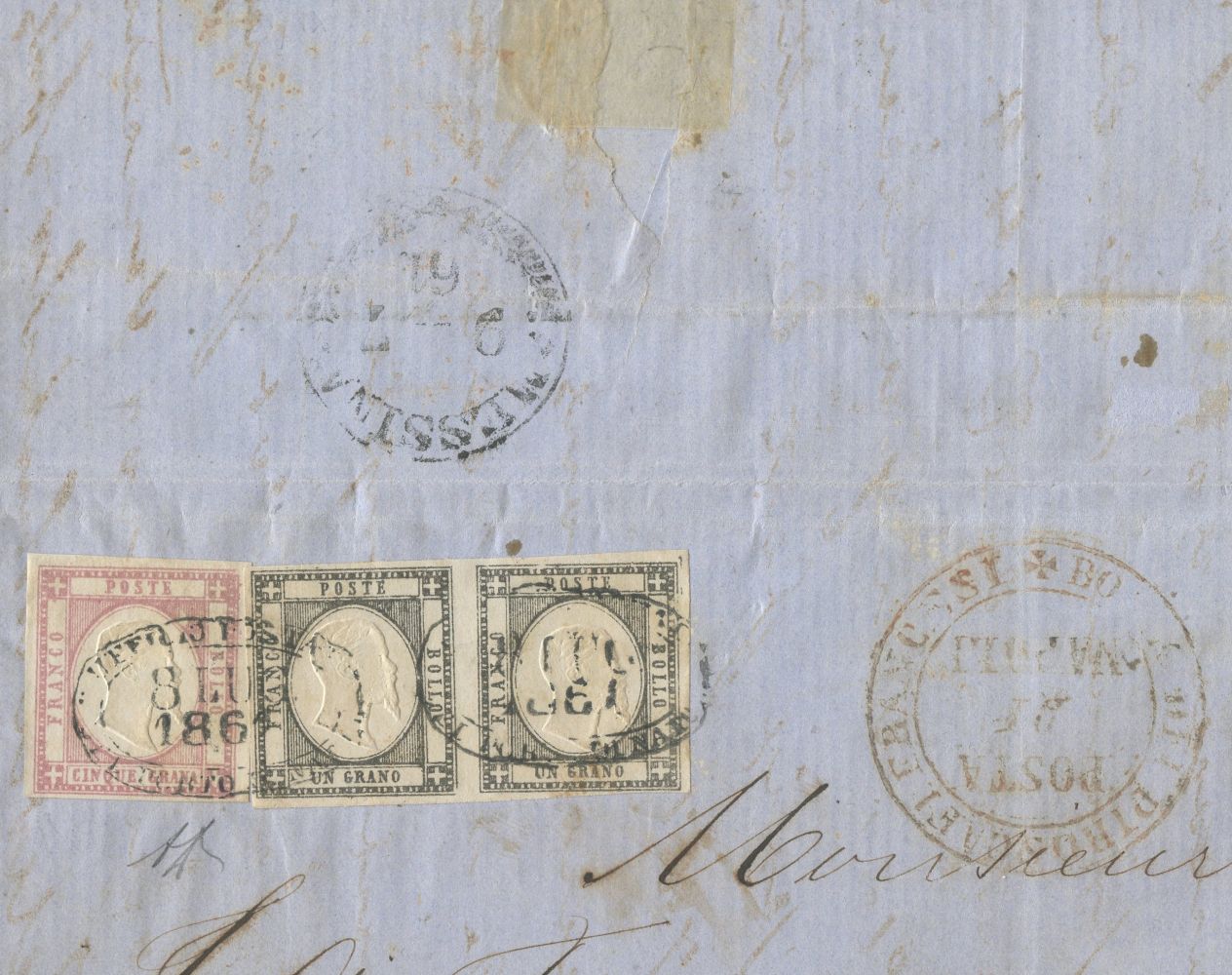 1861 - Frammento di lettera affrancato tramite un 5gr. rosa lilla n.5b + una coppia del 1 gr. grigio scuro n.19a con l'esemplare di destra con filetto di inquadratura parziale nel margine destro, molto raro. (A+)