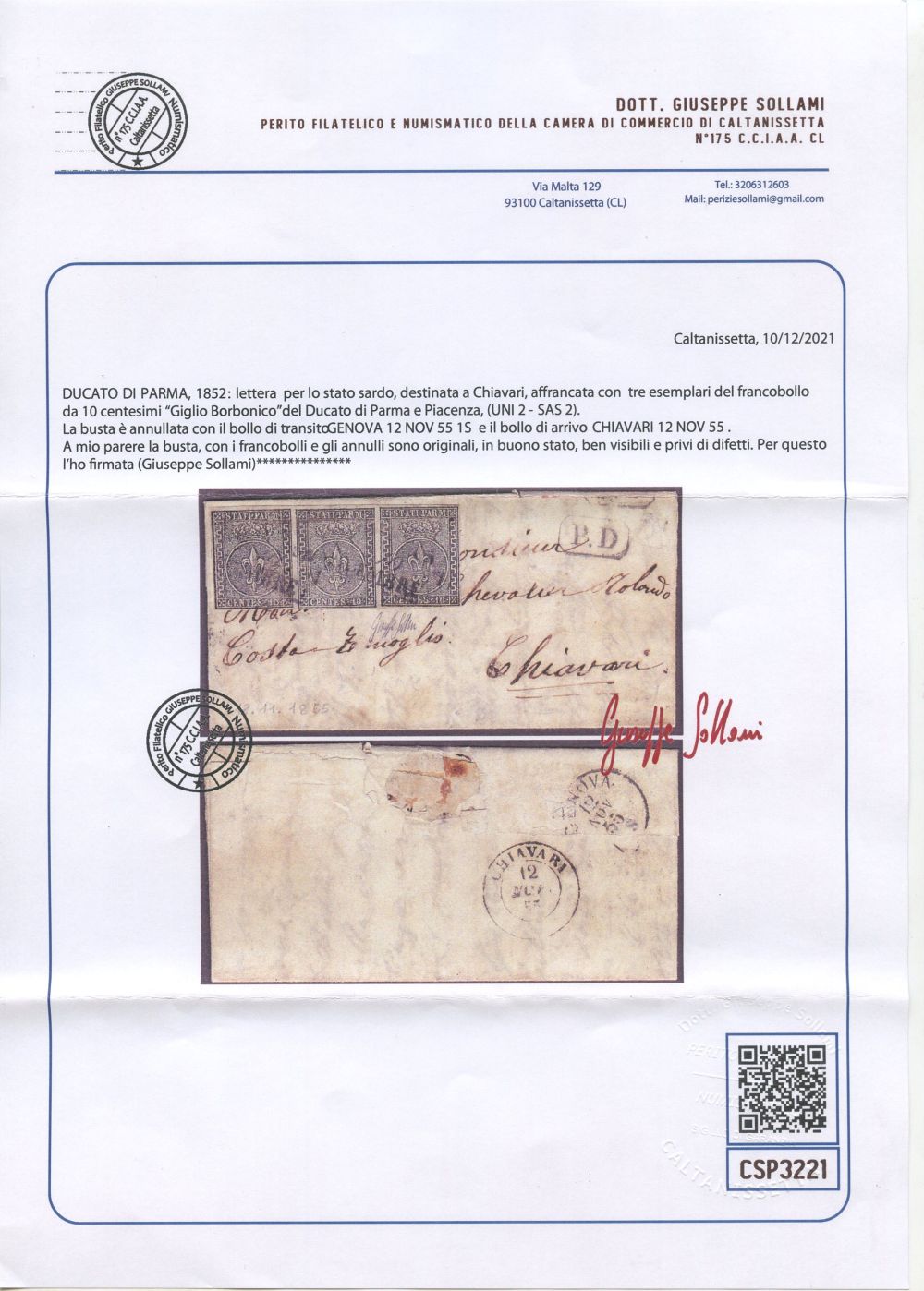 10.11.1855 - Lettera per Chiavari affrancata per 30 centesimi tramite una striscia di tre del 10 cent. bianco n.2. (A-) (Cert. Sollami)