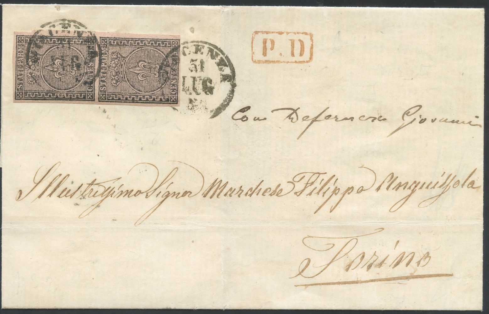 31.07.1856 - Lettera da Piacenza per Torino affrancata per 30 centesimi tramite una coppia di 15 cent. rosa n.3 con bordo di foglio a destra. (A+)