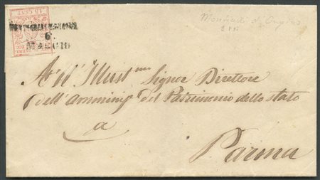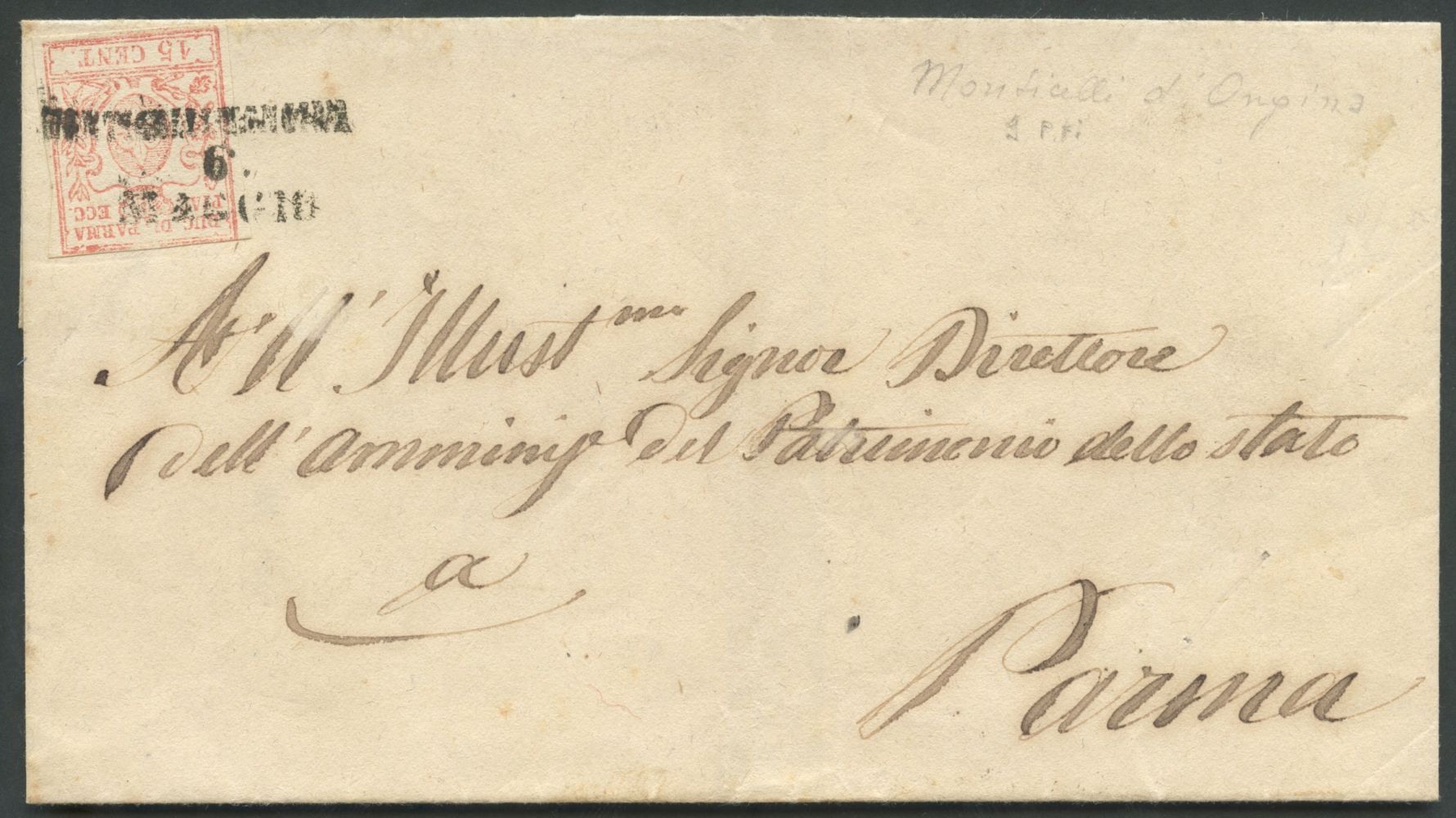 06.05.1859 - Lettera da Monticelli D'ongina per Parma affrancata tramite un 15c. Vermiglio N.9. Sull'affrancatura il Lineare su tre righe di MONTICELLI D'ONGINA (9.pt). (A-)