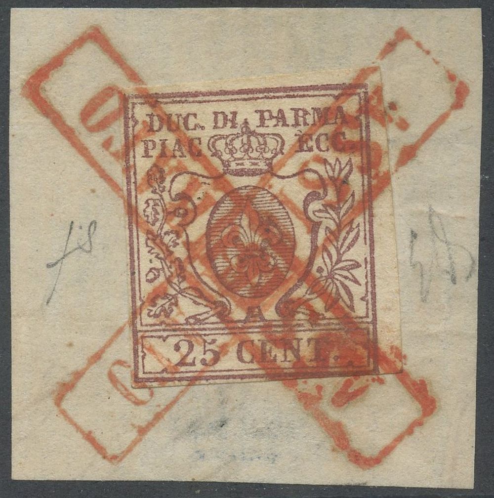 1857 - 25 cent. bruno lilla n.10 usato ed annullato tramite due annulli ''ASSICURATO'' in rosso applicati a formare una croce. (A-) (Emilio Diena)