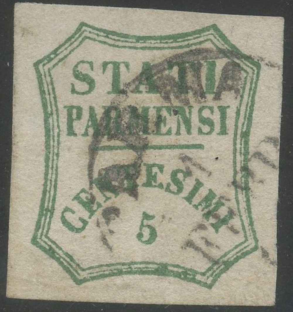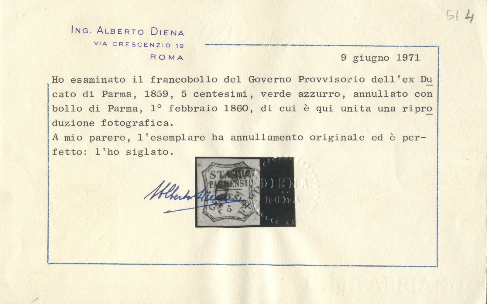 1859 - 5 cent. Verde Azzurro n.12 usato a Parma il 1 Febbraio 1860, in periodo di tolleranza. Straordinaria qualità. (LUX) (Cert. Alberto Diena, Emilio Diena per esteso)