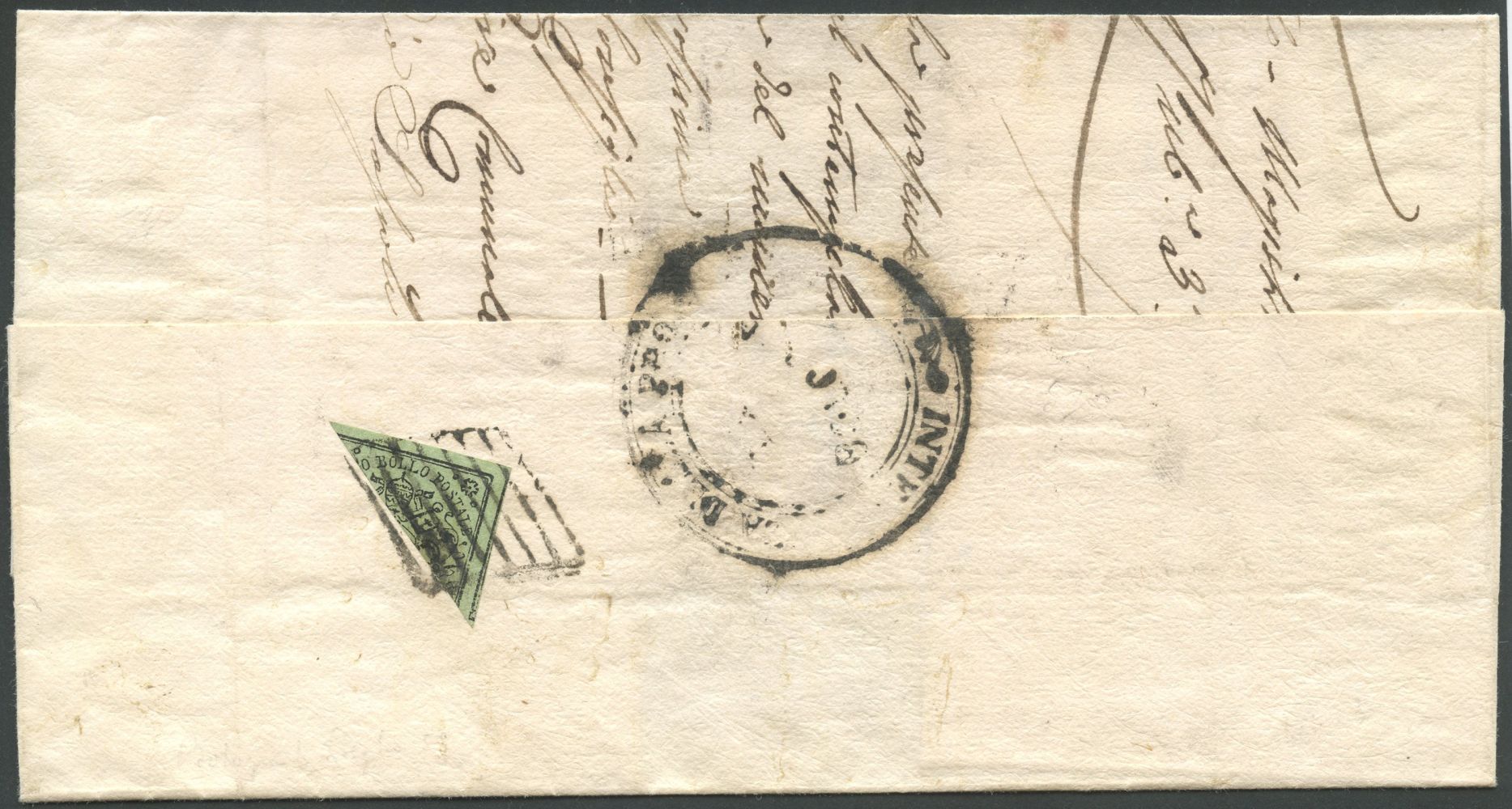06.07.1859 - Francobollo pontificio da 2 baj. frazionato per 1/2 utilizzato durante il governo provvisorio delle Romagne.
